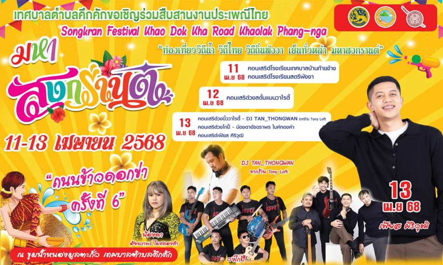 ไปต่อที่จังหวัดพังงา กับ มหาสงกรานต์ ถนนข้าวดอกข่า ครั้งที่ 6 ณ ขุมน้ำหนองมูลตะกั่ว จัดยิ่งใหญ่มาพร้อมอุโมงค์น้ำขนาดใหญ่ ฉีดโฟมแบบจัดเต็ม และรับชมคอนเสิร์ตสุดมันส์ พร้อมเตรียมน้ำใส่ถังไว้บริการให้กับนักท่องเที่ยวเฃ่นกันเพลินๆ ได้ทั้งวัน