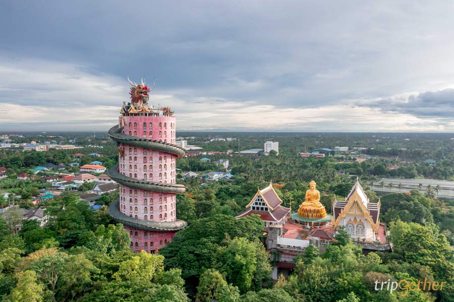 วัดสามพราน วัดไทยสไตล์จีนในจังหวัดนครปฐม โดดเด่นด้วยอาคารสีชมพูที่ถูกมังกรพันรอบอาคาร โดยต้องเดินขึ้นบันไดกว่า 350 ขั้น เพื่อ-ขึ้นไปสักการะสิ่งศักดิ์สิทธิ์ด้านบน และชมวิวแบบ 360 องศา นอกจากนี้ ยังสามารถมาเข้ามาไหว้เจ้าแม่กวนอิมปางประทานพร องค์สีทอง ได้ที่วัดสามพรานอีกด้วย