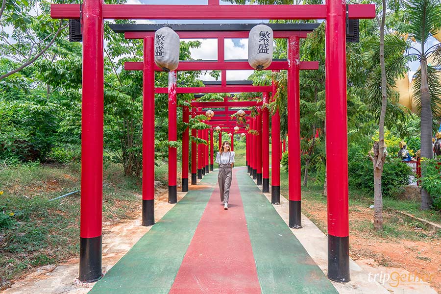 ประเดิมที่แรกด้วยวัดไทยสไตล์ญี่ปุ่นตั้งเด่นตระหง่านอยู่บนยอดเขา วัดเขาดิน บริเวณด้านหน้าวัดตกแต่งด้วยตุ๊กตามาเนคิเนโกะหรือแมวกวัก และตุ๊กตาดารุมะ ซึ่งเป็นตุ๊กตามงคลที่ชาวญี่ปุ่นเชื่อว่าจะทำให้คำอธิษฐานของเราสมปรารถนาทุกประการ หลายคนเดินทางมาที่นี่เพื่อไปกราบสักการะขอพรหลวงพ่อหร่ำเสริมดวงให้กับชีวิต และขึ้นไปด้านบนยอดเขาเพื่อสักการะรอยพระพุทธบาท พระบรมธาตุเจดีย์นวมงคลเศรษฐี เสริมศิริมงคล อีกหนึ่งความพิเศษของวัดเขาดินคือภายในวัดมีการประดับประดาให้มีความเป็นญี่ปุ่นสุดๆ เสาโทริอิเอย ซุ้มซากุระเอย ซึ่งเป็นจุดที่คนนิยมมาถ่ายรูปกัน มูวัดไทยแต่ได้ฟีลเหมือนอยู่ญี่ปุ่น