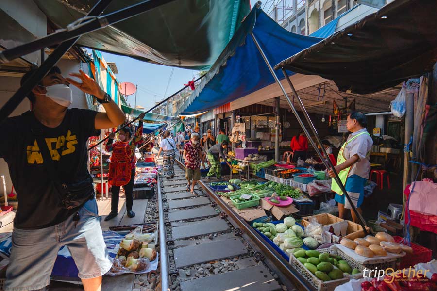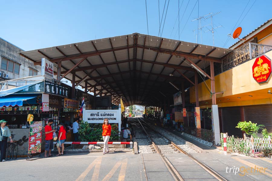 ตลาดร่มหุบ ตลาดที่มีทั้งความคึกคัก และหวาดเสียวในเวลาเดียวกัน จึงมีชื่อเรียกอีกอย่างว่า ตลาดเสี่ยงตาย ตลาดนี้มีมาตั้งแต่ พ.ศ.2527 แม้ว่าบรรยากาศรอบข้างอาจจะไม่มีธรรมชาติ ต้นไม้ใบหญ้าสีเขียวให้เราดูเหมือนแลนด์มาร์กบนทางรถไฟอื่นๆ แต่มีความพิเศษตรงที่ตลาดจะอยู่ติดกับรางรถไฟแบบใกล้ชิดมาก พ่อค้าแม่ค้าจะวางแผงขายของสด ผักสองข้างทาง แล้วเมื่อไหร่ที่รถไฟจะแล่นผ่านตลาด พ่อค้าแม่ค้าจะต้องรีบหุบร่ม เก็บข้าวของ เก็บหลังคากันสาดอย่างรวดเร็ว จึงเป็นที่มาของตลาดร่มหุบ หลังจากที่รถไฟแล่นผ่านแล้ว ก็จะกลับมากางร่ม ขึงกันสาด วางข้าวของขายกันเหมือนเดิม ใครที่ชอบถ่ายภาพรถไฟ ภาพแนวสตรีท มาที่ตลาดร่มหุบไม่ผิดหวังแน่นอน