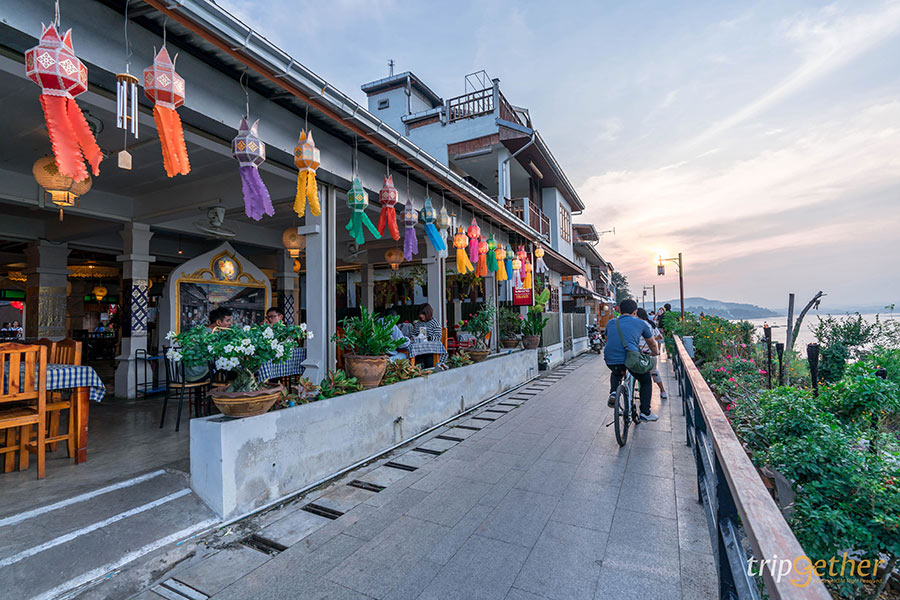 มาเชียงคานแต่ไม่ได้สัมผัสบรรยากาศริมแม่น้ำโขงถือว่าพลาดมากๆ เส้นทางริมฝั่งแม่น้ำโขง เป็นชมวิวที่สวยที่สุดแห่งหนึ่งของเชียงคาน ทางถนนทอดยาวเคียงคู่ไปกับแม่น้ำโขงกับบรรยากาศตึกไม้อันเก่าแก่ที่ดูเสน่ห์น่าหลงใหล หลายคนเลือกที่จะเดิน ดื่มด่ำกับบรรยากาศ หรือปั่นจักรยานชมความสวยงามก็เป็นอีกกิจกรรมยอดฮิตที่ใครมาก็อยากให้มาลองกัน แนะนำช่วงเวลายามเช้าที่อากาศกำลังเย็นสบายและมีความเงียบสงบ สามารถเดินชิลล์ๆ สัมผัสสายหมอกที่อยู่รอบตัวเราได้แบบฟินๆ แต่ถ้าชอบความครึกครื้นหน่อย ในช่วงเย็นๆ ก็จะมีผู้คนเริ่มออกมาชมวิวแม่น้ำโขงและที่สำคัญเส้นทางริมฝั่งแม่น้ำโขงยังใกล้กับถนนคนเดินด้วย หลังจากชมวิวเสร็จก็สามารถเดินไปหาอะไรกินอร่อยๆ ที่ถนนคนเดินได้เลย