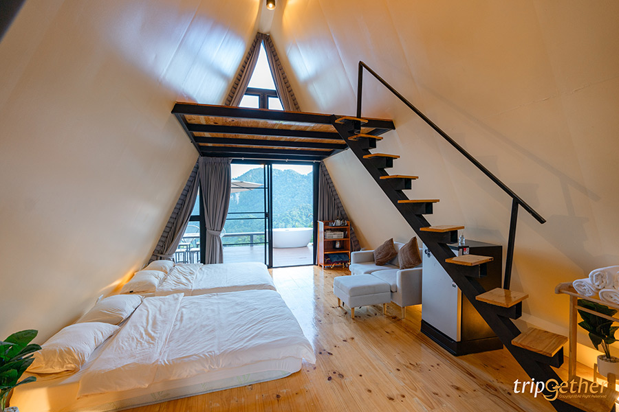 อิงหมอก by บ้านสวนผาฮี้ ที่พักสุดกรีนในหมู่บ้านผาฮี้ จ.เชียงราย โดดเด่นด้วยสไตล์การออกแบบทรงโมเดิร์นเอเฟรม ที่มีลักษณะทรงสามเหลี่ยมตั้งอยู่ห่างกัน ทำให้การบรรยากาศของที่นี่นอกจากจะเป็นส่วนตัวแล้ว ยังสงบและร่มรื่นเป็นที่สุด ภายในห้องพักมีสิ่งอำนวยความสะดวกครบครัน ไม่ว่าจะเป็นเตียงหลังใหญ่ โซฟาสบายๆ ตู้เย็น และอื่นๆ อีกเพียบ นอกจากนี้ยังมีส่วนของระเบียงหน้าห้องที่มีอ่างอาบน้ำและบาร์นั่งห้อยขาที่มองวิวดอยนางนอนได้แบบพาโนรามากันเลย ใครที่อยากมาพักผ่อนในโลเคชั่นที่สวยและเป็นส่วนตัว ขอแนะนำที่นี่เลย