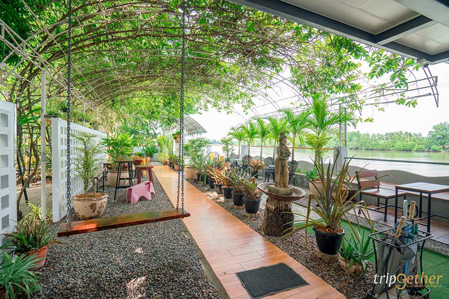 คาเฟ่สุดเท่สะท้อนวิถีชีวิตของชาวสมุทรสงคราม ที่ออกแบบตกแต่งร้านด้วยไม้ไผ่สร้างบรรยากาศให้ดูเรียบง่ายและมีเอกลักษณ์เฉพาะตัวให้กลมกลืนกับธรรมชาติโดยรอบได้เป็นอย่างดี เป็นอีกหนึ่งร้านที่เหมาะมานั่งพักผ่อนชิลล์ๆ จิบกาแฟริมน้ำแม่กลอง และด้วยการเลือกใช้แก้วกาแฟดินเผา ซึ่งเป็นงานทำมือ ที่เสิร์ฟคู่กับกาแฟแก้วอร่อยให้กับคนพิเศษเช่นคุณ และยังมีเมนูแนะนำที่ใครมาแล้วต้องสั่งอย่าง The Buffalo Coffee เมนูซิกเนเจอร์ที่แบ่งเลเยอร์เครื่องดื่มออกเป็นสามชั้นโดยชั้นแรกสามารถเลือกรสชาติได้ทั้งกาแฟและโกโก้ ส่วนชั้นถัดไปเป็นชาไทย และชั้นสุดท้ายเป็นนมสด เรียกได้ว่าเป็นคาเฟ่เก๋ๆ ที่มีเอกลักษณ์เฉพาะตัวที่โดดเด่นเหมาะแก่การมานั่งชิลล์ๆ พร้อมถ่ายรูปสวยๆ ในวันหยุดเสียจริง