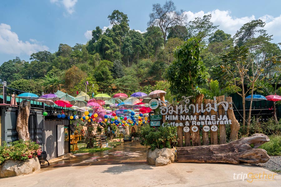 ฮิมแม่น้ำจะ ตั้งอยู่ในเส้นแม่ริม สะเมิง ก่อนขึ้นดอยม่อนแจ่ม เป็นคาเฟ่สีสันสดใสน่ารักมาก ด้วยการตกแต่งด้วยร่มหลากหลายสี ตกแต่งอยู่หลายมุม โดยส่วนของคาเฟ่ที่ขายเครื่องดื่มจะตั้งอยู่ด้านหน้า ส่วนด้านในจะเป็นร้านอาหารที่ตั้งอยู่ริมน้ำตก มีที่นั่งหลายมีทั้งโซนที่นั่งรับประทานอาหารติดริมน้ำ และที่นั่งภายในอาคารสองชั้น ที่นี่มีเมนูอาหารให้เลือกทานมากมาย แถมยังมีสะพานแขวนสวยๆ ให้ถ่ายรูปอัปลงโซเชียลปังๆอีกด้วย เป็นอีกหนึ่งที่ที่แนะนำมากๆ
