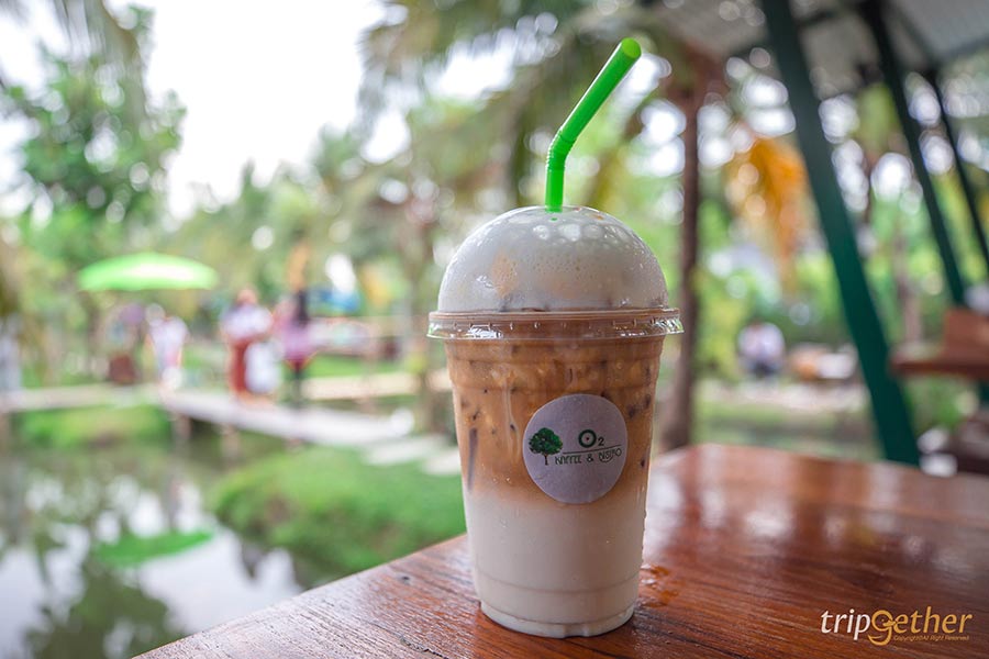 O2 Kaffee & Bistro คาเฟ่ชิลล์ในสวนมะพร้าวที่สามารถลงไปนั่งตามร่องสวนสัมผัสบรรยากาศของต้นมะพร้าวที่เรียงรายตามร่องน้ำของสวนมะพร้าว พร้อมสั่งเมนูเครื่องดื่มและเบเกอรี่มานั่งดื่มด่ำไปกับธรรมชาติที่รายล้อมรอบตัว นอกจากนี้สำหรับคนที่ไม่ชอบนั่งข้างนอกที่นี่ก็มีห้องแอร์ให้นั่งด้วยเช่นกัน โดยทุกเมนูที่ร้านจะมีน้ำมะพร้าวน้ำหอมเป็นส่วนผสม รับรองว่าได้รสชาติที่แปลกใหม่และอร่อยเพลินทุกเมนูแน่นอน