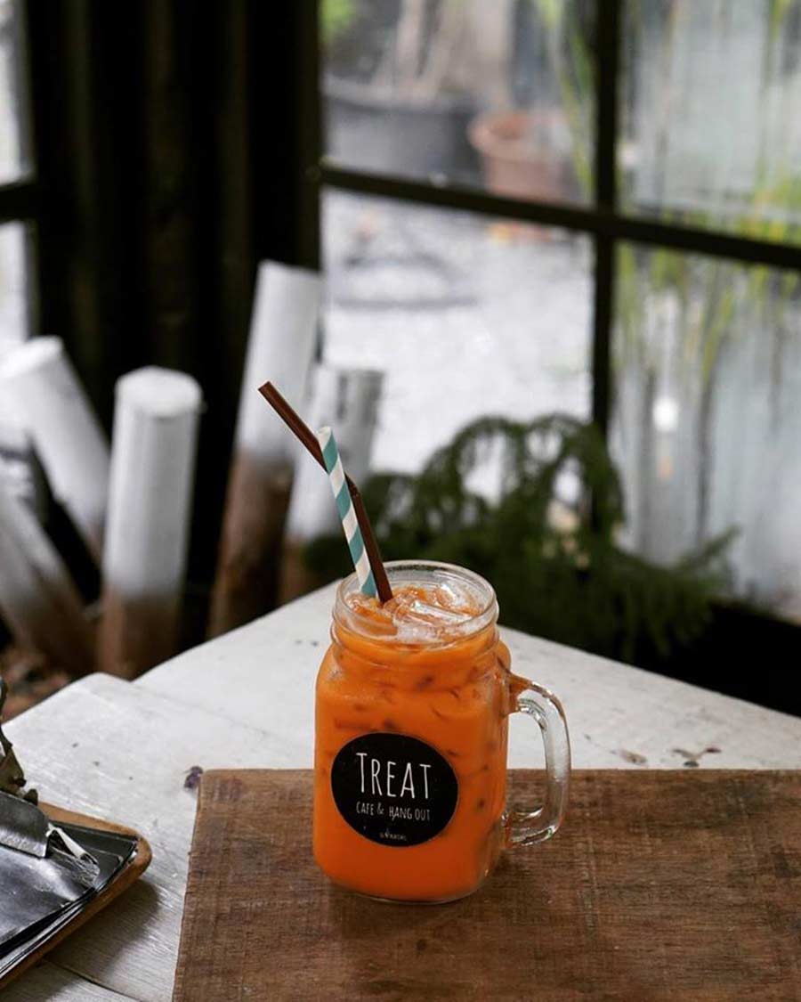 ทรีท คาเฟ่ แอนด์ แฮงเอาท์ (Treat Café & Hang Out) เรียกได้ว่าเป็นแหล่งโอโซนใหม่ที่คนกรุงต้องพุ่งตัวไปด่วนค่ะ เพราะร้านนี้ถูกโอบล้อมไปด้วยสวนร่มรื่นสบายตา ที่นั่งของร้านจะแบ่งออกเป็น 2 โซนใหญ่ ๆ ได้แก่อินดอร์และเอาท์ดอร์ ซึ่งด้านนอกจะเป็นสวนมีต้นไม้นานาชนิด มีกลาสเฮ้าส์ทั้งที่พื้นและบนต้นไม้ให้ลูกค้าได้เลือกใช้บริการ ส่วนด้านในจะเป็นโซนเคาน์เตอร์ ตกแต่งด้วยโทนสีขาวและมีดอกไม้แห้งประดับตามจุดต่าง ๆ ให้ดูอบอุ่น ส่วนเมนูของทางร้านก็มีให้เลือกมากมาย แต่ที่เด็ดก็ต้องเป็นชาไทยนี่แหละค่ะ