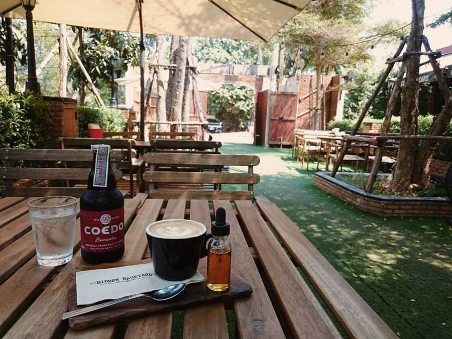 ฮิดเด้นแบ็กยาร์ด (Hidden Backyard) ที่นี่ตกแต่งได้โดดเด่นด้วยสไตล์อินดัสเทรียลให้ดูดิบเท่ เน้นใช้ไม้ อิฐ และเหล็ก รายล้อมไปด้วยต้นไม้นานาชนิดจนกลายเป็นร้านในสวนที่ดูร่มรื่นแต่เท่ไม่เหมือนใคร ที่นั่งของทางร้านทั้งที่เป็นอินดอร์และเอาท์ดอร์ ส่วนเมนูของทางร้านถูกครีเอทมาเพื่อเอาใจคนชอบชิลล์โดยเฉพาะ มีทั้งอาหารจานหลัก อาหารทานเล่น ของหวาน เครื่องดื่มสูตรเบาไปจนถึงเบียร์