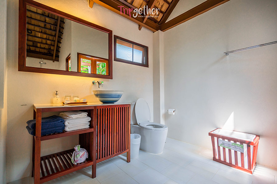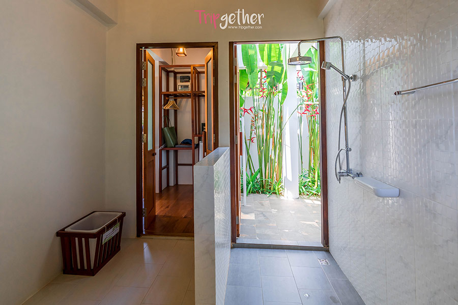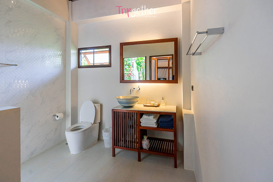 ห้องน้ำที่นี่ก็กว้างขวางเช่นกัน แบ่งเป็นโซนเปียกและแห้ง แถมยังมีโซนโอเพ่น ให้คุณได้อาบน้ำชมแสงเดือน แสงดาวยามค่ำคืนแบบฟินๆ