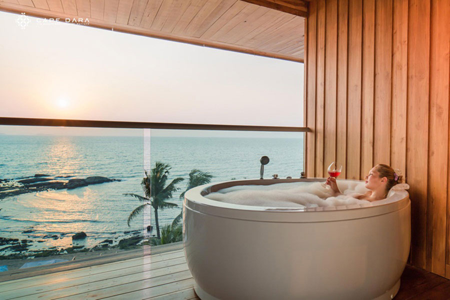 “เคปดารา รีสอร์ท” ที่พักหรูระดับ 5 ดาวตกแต่งสไตล์โมเดิร์น ที่เน้นความเรียบง่ายและใช้สีที่สบายตา ทำให้รู้สึกผ่อนคลายสบายๆ โดยที่พักมีให้เลือกถึง 11 แบบให้คุณได้เลือกตามความชอบ สิ่งอำนวยความสะดวกภายในห้องก็ครบครัน ส่วนอ่างจากุซซี่ริมระเบียงจะมีที่โซน Dara Beachfront นะคะ คุณสามารถแช่นำ้และมองวิวตากระเบียงห้องไปเจอทะเลได้เลย นอกจากนี้ก็มีสระว่ายน้ำส่วนกลาง ร้านอาหารและบาร์ บริการนวดสปา และอื่นๆ อีกมากมายเรียกได้ว่ามาทีเดียวแล้วครบจบเลยนะคะ