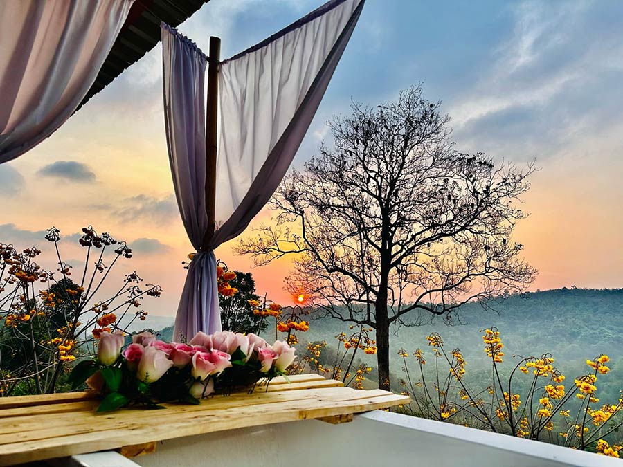 ภูลมโล เอเดน ที่พักในหมู่บ้านร่องกล้าที่มาพร้อมกับบรรยากาศสุดโรแมนติกในช่วงที่ต้นพญาเสือโคร่งบาน ข้อดีของที่นี่คือการที่เราได้เห็นเจ้าดอกชมพูนี้บานอยากใกล้ชิด มองดูได้จากในห้องพัก อีกทั้งที่พักยังอยู่ใกล้กับที่เที่ยวฮิตๆ อย่างภูลมโล อุทยานเเห่งชาติภูหินร่องกล้า และภูทับเบิก ส่วนบ้านพักจะมีให้เลือกตั้งแต่เข้าพักเป็นคู่ไปจนถึงเป็นกลุ่ม และห้องไฮไลท์ก็ต้องห้องกระจกที่เข้าพักได้ 4 – 5 คน เป็นห้องที่ให้เห็นวิวธรรมชาติได้แบบรอบทิศ บอกเลยว่าถ้ามาช่วงดอกพญาเสือโคร่งบานจะต้องฟินสุดๆ