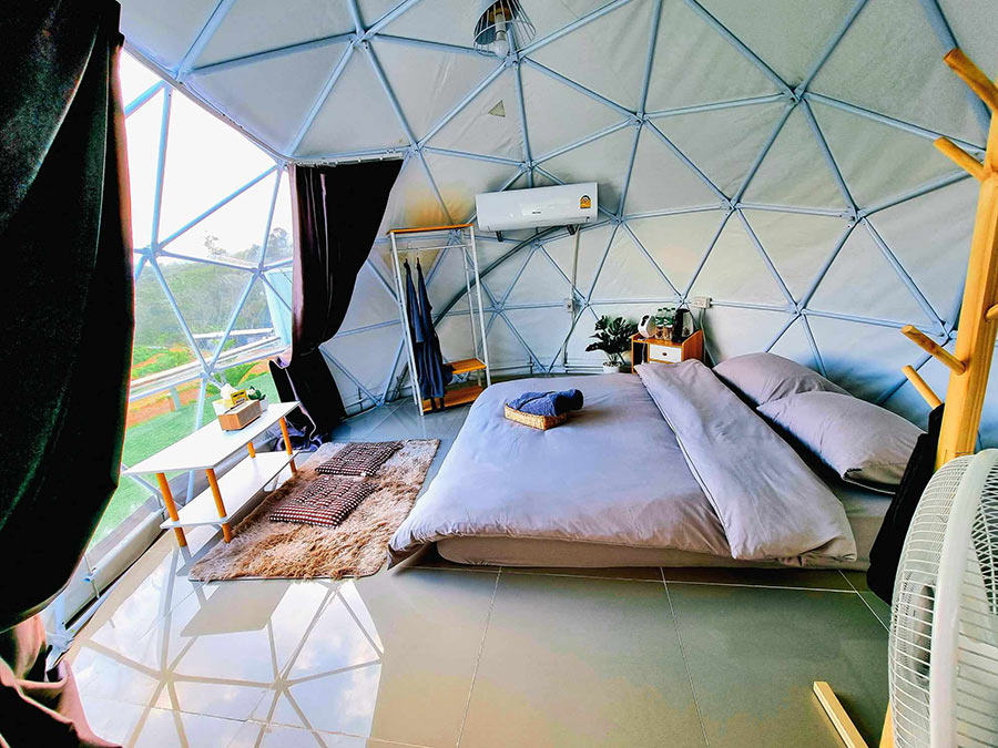 ภูรักษ์ดิน ที่พักภูลมโลท่ามกลางธรรมชาติ ถูกโอบล้อมด้วยขุนเขาและวิวความกรีนแบบพาโนรามา ยิ่งถ้ามาช่วงหน้าหนาว อุณหภูมิลดลงไปถึงหลักสิบได้เลย ดังนั้นแนะนำให้เตรียมเสื้อกันหนาวกันมาด้วย สำหรับประเภทห้องพักมีเต็นท์กระโจม เต็นท์โดม และบ้านพัก ทุกหลังมีห้องน้ำส่วนตัวพร้อมเครื่องทำน้ำอุ่น รวมถึงมีเซ็ตชาบูร้อนๆ ที่รวมอยู่ในค่าห้องพักด้วย บอกเลยว่าเป็นอีกที่พักที่บรรยากาศดี เหมาะแก่การมานอนชิลล์ ให้ธรรมชาติดีท็อกซ์ความเหนื่อยล้าสุดๆ
