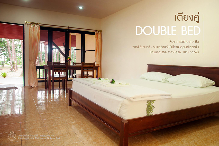 Price: บ้านพักราคาเริ่มต้นที่ 800-1,800 บาท/คืน เต้นท์ขนาด 3 คน ราคา 450 บาท/คืน (รวมชุดนอน) (ราคาอาจมีการเปลี่ยนแปลงตามฤดูกาล กรุณาโทรสอบถามล่วงหน้า)