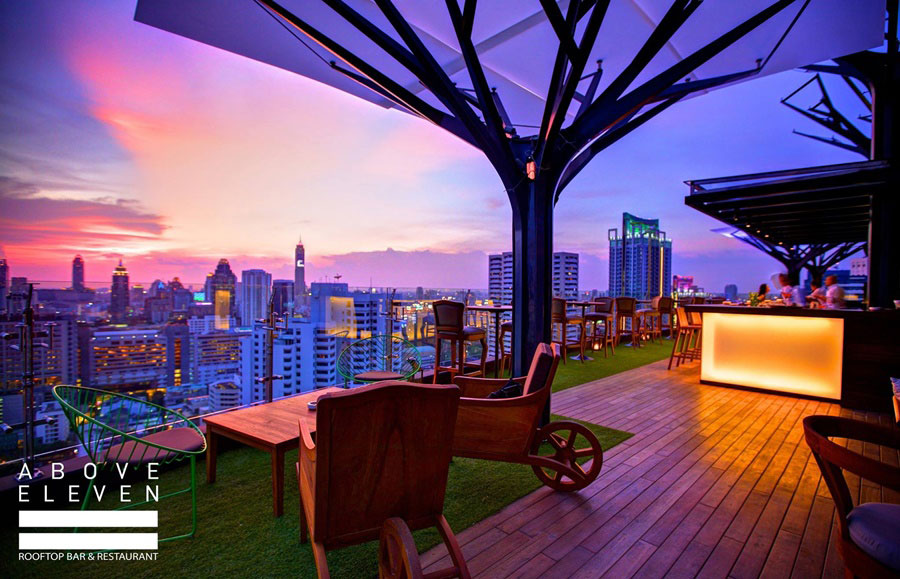 อโบฟ อีเลเว่น (Above Eleven) ร้านอาหารรูฟท็อปที่ตั้งอยู่บนโรงแรม Fraser Suite ย่านสุขุมวิท เน้นการตกแต่งแนวคลาสสิกและความสวยงามของธรรมชาติเข้ามาประยุกต์ จนเกิดเป็นมุมหลังคาต้นไม้กระจก ประดับพื้นบางส่วนด้วยพื้นหญ้าเทียมให้ดูสบายตา หากมองจากร้านออกมานอกระเบียงจะเห็นวิวเมืองหลวงได้อย่างเต็มอิ่ม สำหรับเมนูของทางร้านก็เด็ดไม่แพ้กันการตกแต่ง เพราะเมนูของที่นี่จะเป็นอาหารฟิวชั่นที่นำกลิ่นอายของเปรูและญี่ปุ่นมารวมกัน