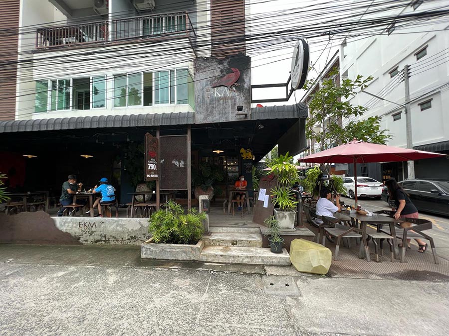 EKAA Breakfast & Coffee ร้าน Breakfast ใกล้ทะเลบางแสนที่มีเมนูอาหารเช้าแบบไทยและฝรั่งเสิร์ฟมากมาย การตกแต่งร้านเน้นโทนสีดำเป็นหลัก ให้ความรู้สึกเท่และมีเอกลักษณ์ ส่วนของเมนูที่นี่มีทั้งอาหารคาว หวาน ชา กาแฟ ขนมปัง ให้เลือกเพียบ เมนูแนะนำของร้าน EKAA Breakfast & Coffee ก็จะเป็น Club Sandwich EKAA, EKAA Egg Toast และ EKAA Waffles Breakfast หรือใครเป็นสายข้าวทางร้านมี ข้าวไข่ขยี้ไก่ย่าง ข้าวต้ม EKAA และเมนูใหม่อย่าง ข้าวหน้าสันคอ ย่างซอส ให้เลือกสั่งกันด้วย แต่ถ้ามื้อเช้าใครเป็นสายกินเบาๆ ก็สามารถสั่งชาร้อน ปาท่องโก๋ หรือไข่ลวก มาร้องท้องได้เช่นกัน