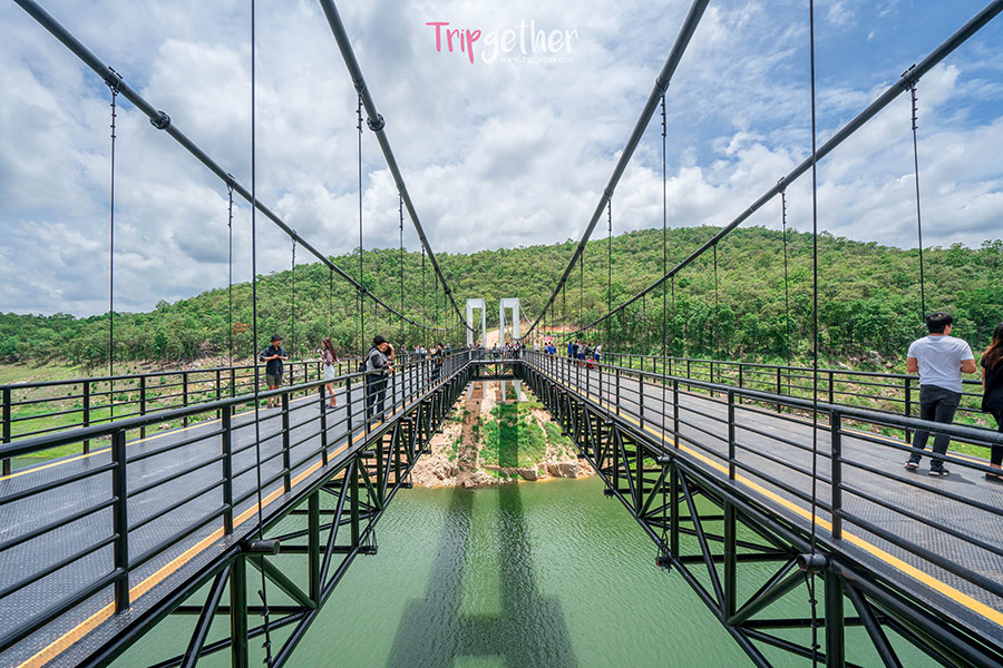อีกหนึ่งสะพานแขวนสวย ที่ตั้งอยู่ในอุทยานแห่งชาติแก่งกระจาน ตัวสะพานทำจากไม้ ยึดด้วยเชือกสลิงและเสาเหล็ก ด้วยอายุการใช้การที่ยาวนาน ก็ทรุดโทรมไปบ้าง แต่ก็ยังถูกปรับปรุงอยู่เสมอ ตัวสะพานนั้นมีความยาว 500 เมตร ทอดยาวไปยังเกาะกลาง แต่ถูกกั้นไว้เพียงครึ่งเดียว เพื่อป้องกันฝูงลิงบนเกาะที่ค่อนข้างดุร้าย นอกจากนี้รอบๆ สะพาน ยังมีลานกางเต็นท์ และกิจกรรมให้สนุกอย่างเรือชมเขื่อนอีกด้วย หากว่าใครมาแก่งกระจานแล้วไม่ได้ถ่ายรูปกันสะพานนี้ ขอบอกว่าคุณยังมาไม่ถึง!