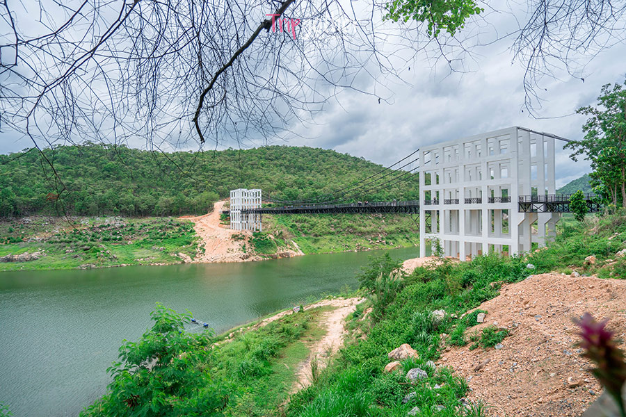 เริ่มกันที่สะพานแรก ตั้งอยู่ที่จุดท่องเที่ยวสุดฮิตในจังหวัดราชบุรี อุทยานเขาหินงู เดิมทีที่นี่เป็นเหมืองย่อยหินเก่าสมัยรัตนโกสินทร์ จนผ่านเวลานับหลายสิบปี ก็หลายเป็นบึงน้ำขนาดใหญ่ ที่รายล้อมด้วยภูเขาสูง โดดเด่นอยู่กลางเมืองราชบุรี ส่วนสะพานแขวนมุมไฮไลท์นั้น มีความยาวประมาณ 100 เมตร เป็นทรงโค้งครึ่งวงกลม ทอดยาวข้ามบึงไปอีกฝั่งทางเดิน สามารถยืนโพสต์ท่าได้แบบจัดเต็ม เพราะสะพานค่อนข้างกว้าง หรือจะชมบรรยากาศ ป้อนอาหารแบบชิลล์ๆ ก็คุ้ม