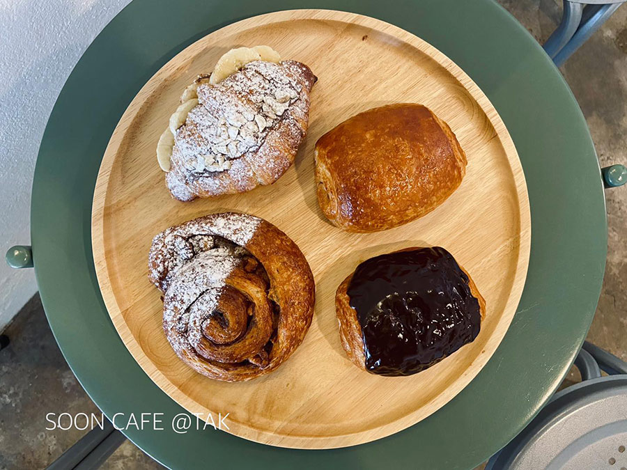 SOON CAFE คาเฟ่เล็กๆ ในอำเภอเมืองตาก ใกล้กับสวนสุขภาพเทศบาลเมืองตาก ถนนจอมพล ภายในร้านตกแต่งแบบเรียบง่ายสไตล์มินิมอล คุมโทนสีขาว น้ำตาล อย่างสวยงาม ความพิเศษคือทางร้านเป็นเบเกอรี่แบบโฮมเมดทำสดใหม่ให้เลือกมากมายไม่ว่าจะครัวซองต์ พาย บราวนี่ เดนิส ขนมปัง และเค้กหน้าต่างๆ บอกเลยว่าน่ากินสุดๆ นอกจากนั้นยังมีเมนูเครื่องดื่มอย่างชา กาแฟ ให้เลือกเพียบ ทริปต่อไปใครกำลังแพลนเที่ยวตัวเมืองตากแล้วมองหาคาเฟ่ดีๆ ขนมอร่อย กาแฟเลิศ ลองแวะมาที่ SOON CAFE กันได้
