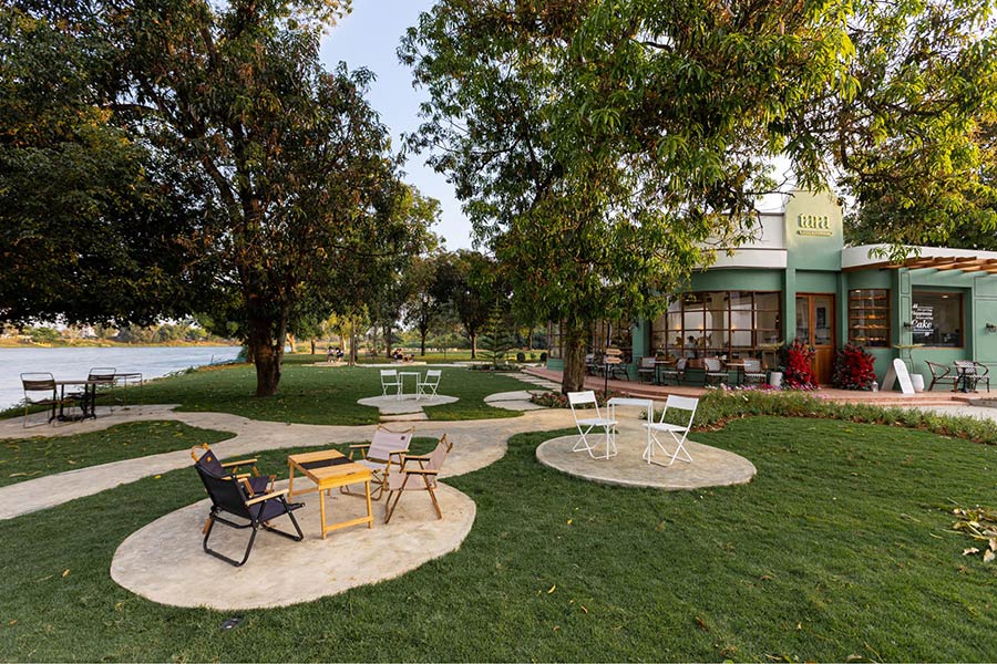TARA Kaffee&Patisserie’ คาเฟ่ดีไซน์สวยริมแม่น้ำปิงในตัวเมืองจังหวัดตาก โดดเด่นด้วยตัวร้านสีเขียวสไตล์ยุโรปมีน้ำพุตรงกลางแบบสวนอังกฤษ มาพร้อมมุมถ่ายรูปเพียบที่บอกเลยว่าใครกำลังมองหาคาเฟ่ตากในเมืองเพื่อถ่ายรูปเช็คอินอัปลงโซเชียลต้องที่นี่เลย ตัวร้านมีทั้งโซนที่นั่งอินดอร์แอร์เย็นๆ และโซนเอาท์ดอร์กลางสนามหญ้าใต้ร่มเงาไม้ใหญ่ให้รับลมชมวิวแม่น้ำปิงแบบชิลล์ๆ หรือใครอยากจัดปาร์ตี้เล็กๆ ทางร้านก็มีห้องส่วนตัวที่รองรับได้ถึง 10 คนให้บริการ สำหรับเมนูเครื่องดื่มมีทั้งเมนู Coffee และ เมนู Non Coffee ให้เลือก นอกจากนั้นเบเกอรี่ก็บอกเลยว่าห้ามพลาดเพราะหน้าตาน่ากินสุดๆ เช่น Banana Cream Pie, Blueberry Crumble Cheesecake, Blueberry swirl cheesecake, Fudgy Brownie และ Korean garlic bread หรือใครอยากกินอาหารคาวทางร้านก็มีให้เลือกหลากหลายเมนู