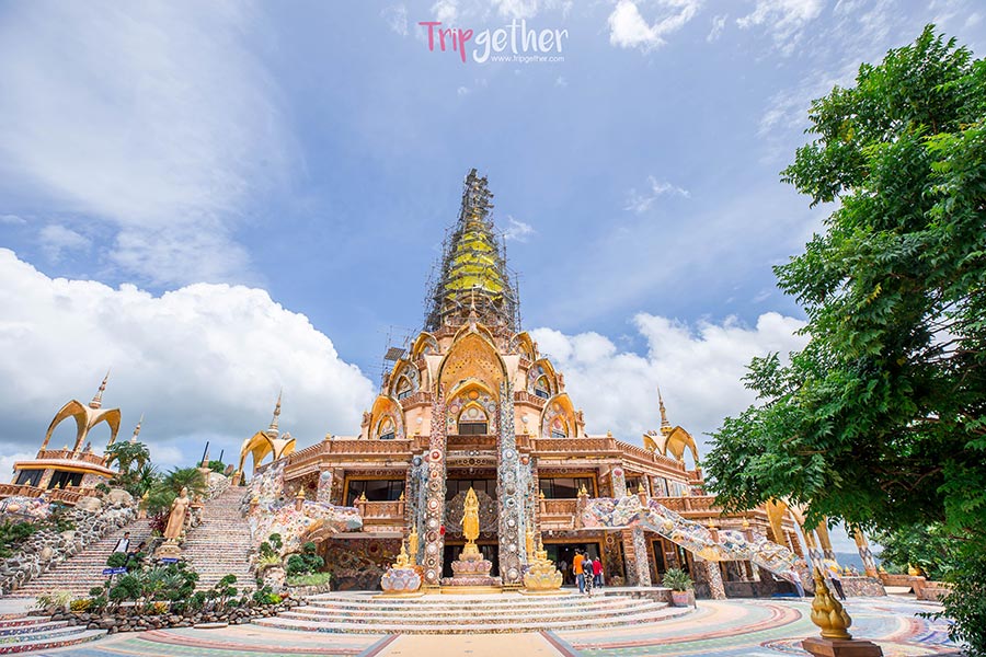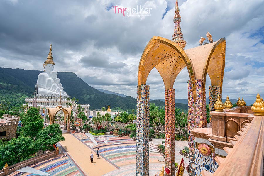 วัดพระธาตุผาซ้อนแก้ว ถูกสร้างขึ้นเพื่อถวายเป็นพระราชกุศลให้พระบาทสมเด็จพระปรมินทร์มหาภูมิพลอดุลยเดช เนื่องในวโรกาสที่ทรงครองราชย์ครบ 60 ปี ไฮไลท์ของวัดแบ่งออกเป็น 2 โซนหลักคือบริเวณโบถส์ที่ตกแต่งด้วยกระเบื้องสีเคลือบเบญจรงค์ และเซรามิคหลากสีสัน ตลอดจนถึงสิ่งมีของค่าต่างๆ จึงทำให้เกิดความสวยงาม ยิ่งเมื่อโดนแสงแดดจะยิ่งส่องประกายงดงามสวยงามมากๆ และบริเวณลานองค์พระพุทธเจ้า 5 พระองค์ และนอกจากความสวยสวยงามที่สะกดให้หลายๆ คนแวะมาแล้ส ที่นี่ยังเป็นจุดชมวิวทะเลหมอกที่สวยที่สุดเป็นอันดับต้นๆ ของเขาค้ออีกด้วย