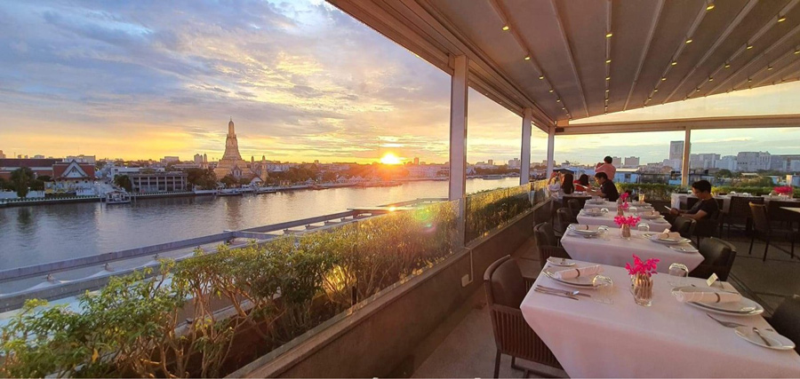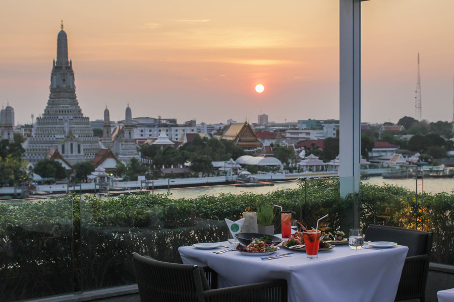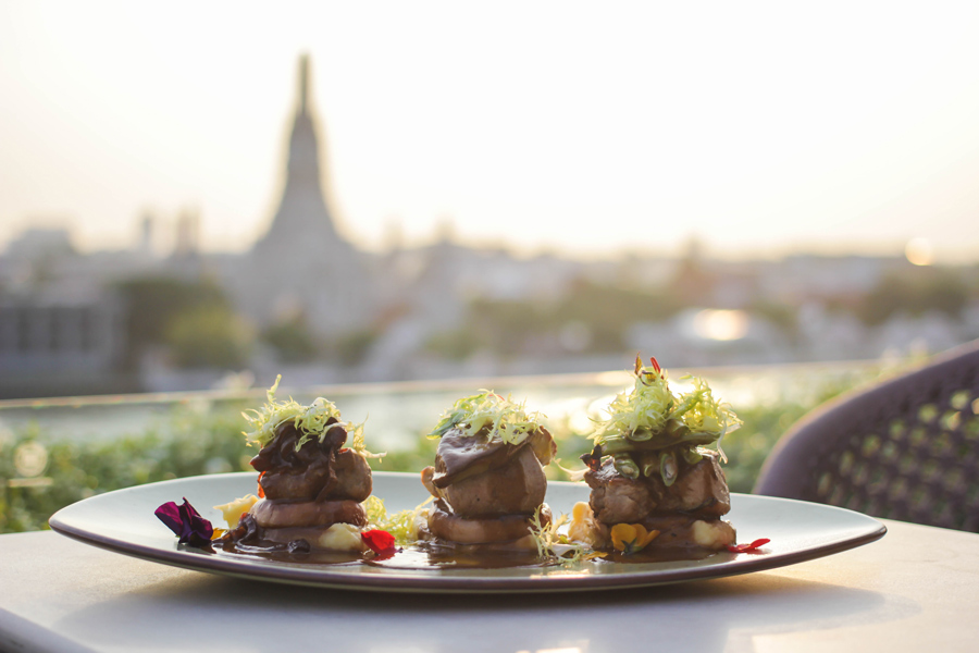 Above Riva Rooftop Bar & Restaurant บาร์รูฟท็อปเปิดใหม่บนดาดฟ้าโรงแรม Riva Arun พิเศษสุดๆ ตรงที่สามารถมองเห็นได้ทั้งวิวแม่น้ำเจ้าพระยาและวัดอรุณฯ อย่างชัดเจน ถ้ามาช่วงพระอาทิตย์ตกจะสามารถชมแสงทไวไลท์ได้ ถ่ายรูปก็ปังสุด ส่วนเมนูของที่นี่จะเน้นเป็นเมนูแนว Thai Twist ผสมผสานรสชาติความเป็นไทยกับวัตถุดิบนานาชาติระดับโลก เช่น Calamari Salted Eggs หมึกชุบแป้งทอด ราดซอสที่ทำจากไข่กุ้งและไข่เค็ม โรยด้วยไข่ปลาแซลมอนและดอกโสนทอด ตกแต่งจานด้วยกลีบดอกไม้อย่างสวยงาม
