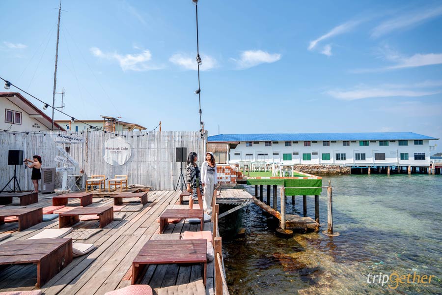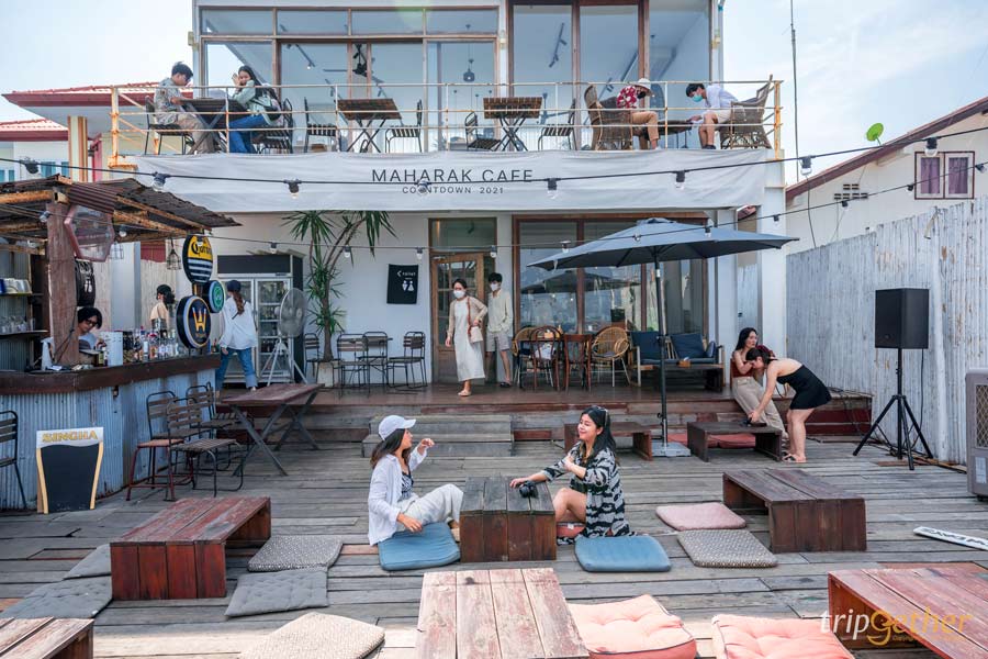 ถัดมาที่อีกหนึ่ง คาเฟ่เกาะล้าน สุดน่ารักมาในโทนสีขาวตัดกับน้ำทะเลสีฟ้าครามแบบลงตัวมาก ใครชอบความคลีน ความมินิมอล ห้ามพลาด มาหารักคาเฟ่ (Maharak Cafe) ตัวร้านมีทั้งหมด 2 ชั้น เลือกนั่งได้ทั้งห้องแอร์และโซนติดทะเลเลย ช่วงเย็นๆ บอกเลยว่าโรแมนติกมาก ในส่วนเมนูมีครบทั้งอาหารไทย อาหารฝรั่ง เบเกอรี่ และเครื่องดื่มสดชื่น ใครอยากหาร้านนั่งกินอาหารเย็นพร้อมวิวละมุนใจ ร้านนี้ตอบโจทย์แบบสุดๆ