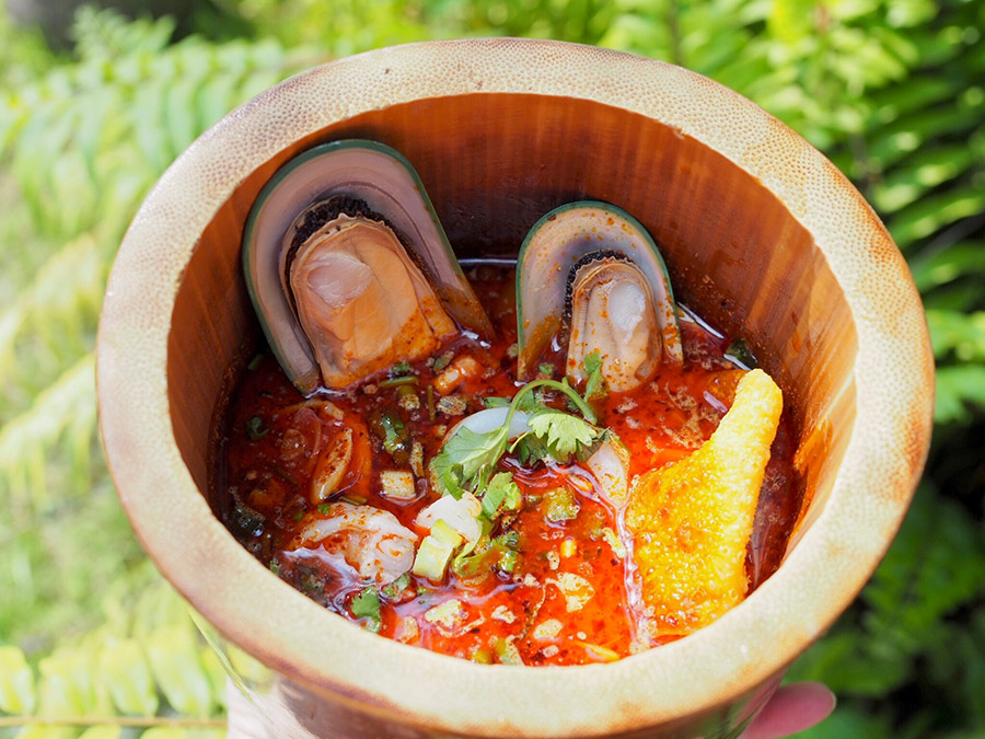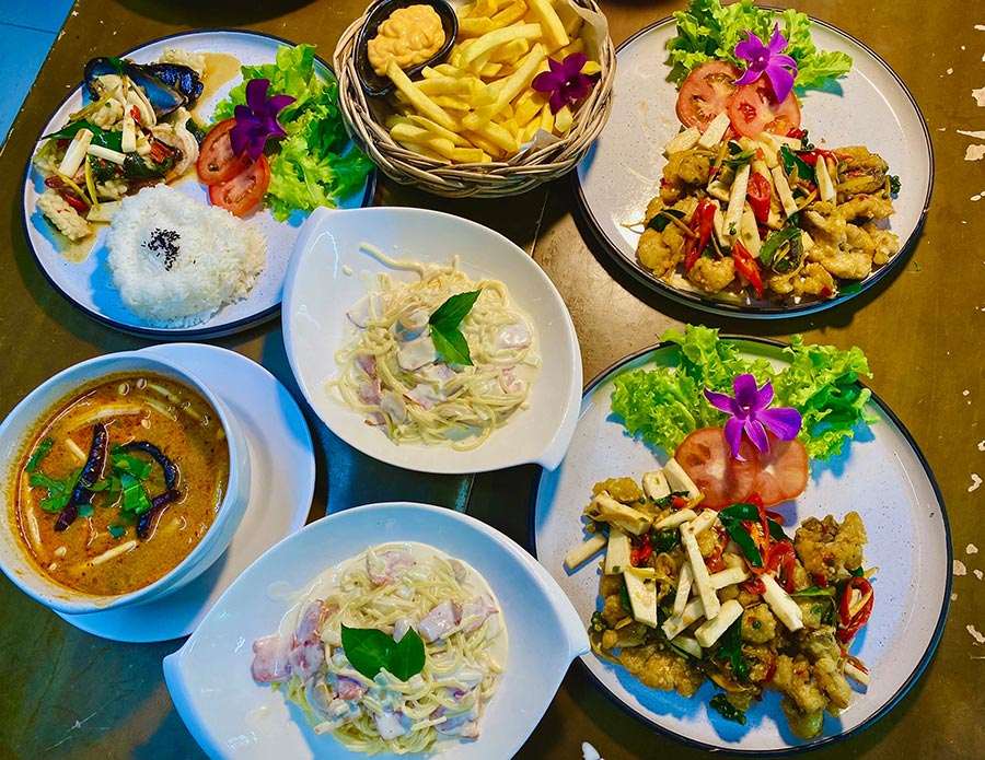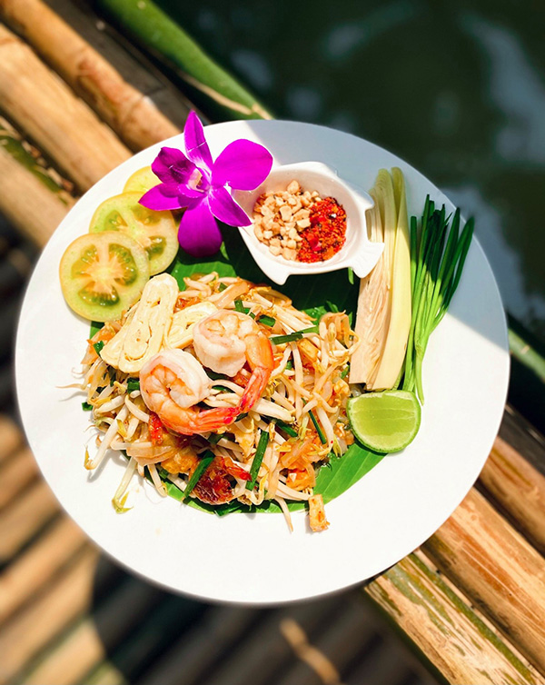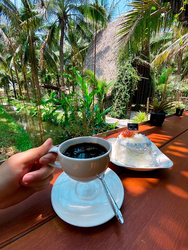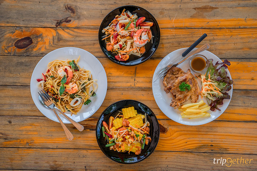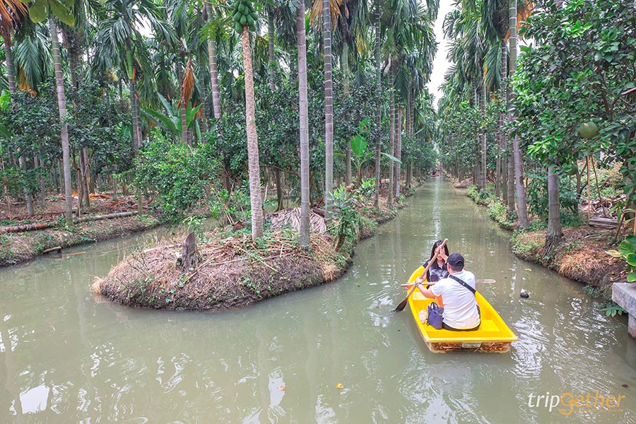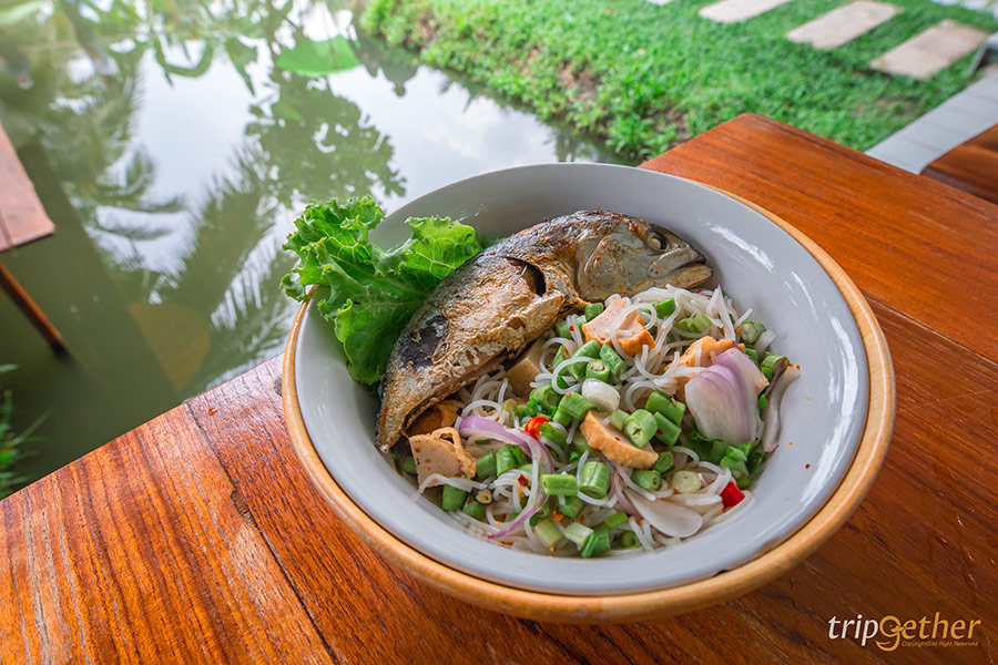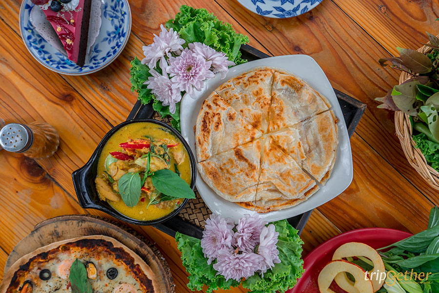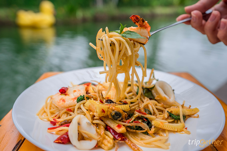 จุดเช็คอินร้านแรกก็คือ ตาลพวา คาเฟ่เล็กๆ ท่ามกลางสวนมะพร้าวที่มีเสิร์ฟทั้งอาหาร เครื่องดื่ม และขนมหวานเลย บรรยากาศร้านจะเป็นแบบบ้านสวน มีโต๊ะให้นั่งชิลล์อยู่ริมคลอง แถมยังมีกิจกรรมพายเรือให้ทุกคนได้สัมผัสบรรยากาศธรรมชาติอย่างใกล้ชิด ร้านจะอยู่ท่ามกลางสวนมะพร้าว อากาศจึงเย็นสบาย อาหารมีให้เลือกกินหลากหลาย โดยอาหารของที่ร้านจะเป็นการนำวัตถุดิบในสวนของร้านเองมาประกอบอาหารแล้วเสิร์ฟให้เรากินกัน ทำให้รสชาติอาหารออกมามีความหอมอร่อย สดใหม่ ติดใจทุกคนอย่างแน่นอน