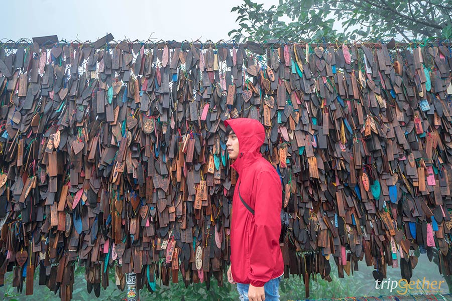 มาเริ่มกันที่จุดเช็คอินบ้านอีต่องจุดแรกที่ สะพานป้ายไม้ เป็นสะพานข้ามสระน้ำตั้งอยู่บริเวณหน้าหมู่บ้าน ตลอดสองข้างทางของสะพานจะมีป้ายไม้ห้อยเป็นเหมือนสัญญลักษณ์ที่ใครมาต่างทิ้งร่องรอยและความทรงจำไว้ที่แห่งนี้ เรียกได้ว่าเป็นสะพานที่เต็มไปด้วยเรื่องราว ดังนั้นใครที่มาแล้วอย่าลืมซื้อแผ่นป้ายไม้และเขียนข้อเพื่อบอกว่าครั้งหนึ่งเราเคยเดินทางมาแล้ว และห้ามพลาดถ่ายรูปเก๋ๆ คู่กับแผ่นป้ายด้วยนะ นอกจากนี้บนสะพานนี้ยังเป็นจุดชมวิวหมู่บ้านที่สวยงามมาก จากบนสะพานสามารถมองเห็นสระน้ำขนาดใหญ่ถูกขนาบกลางธรรมชาติและบ้านเรือนต่างๆ บอกเลยว่าถ่ายรูปมาสวยปังมาก