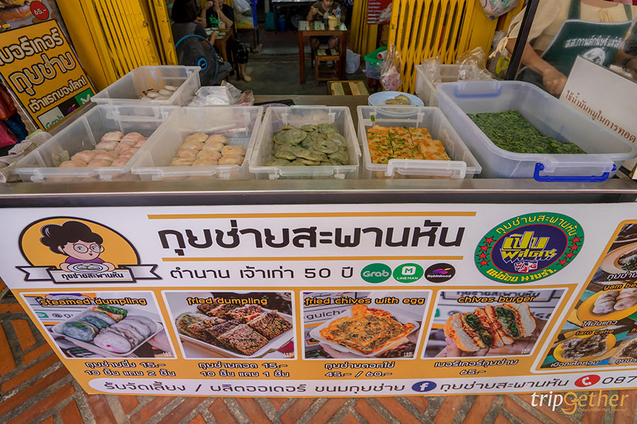 เราพาทุกคนไปต่อกันที่ย่านสำเพ็ง ใครที่เป็นสายช้อปต้องคุ้นเคยกับย่านนี้เป็นอย่างดีและมาถึงที่นี่ก็ต้องแวะกันที่ กุยช่ายสะพานหัน ตัวร้านสีเหลืองโดดเด่นตั้งอยู่ริมคลองโอ่งอ่าง ร้านเด่นร้านดังที่เปิดมากว่า 50 ปี มีกุยช่ายมากมายหลายไส้ให้เราเลือกชิม มีกุยช่ายหน้าตาที่เราคุ้นเคยที่เป็นแบบกลมและแบบเหลี่ยม สามารถเลือกได้ว่าจะกินแบบนึ่งหรือทอด นอกจากนี้ยังมีไส้อื่นๆ อีกด้วยไม่ว่าจะเป็น ไส้หน่อไม้ ไส่เผือก ไส้มันแกว ขนมผักกาด และเผือกเห็ดหอม บอกเลยว่ากุยช่ายสะพานหันเป็นอีกหนึ่งร้านอร่อยในกรุงเทพฯ ที่แนะนำให้ทุกคนมาลิ้มลองกัน