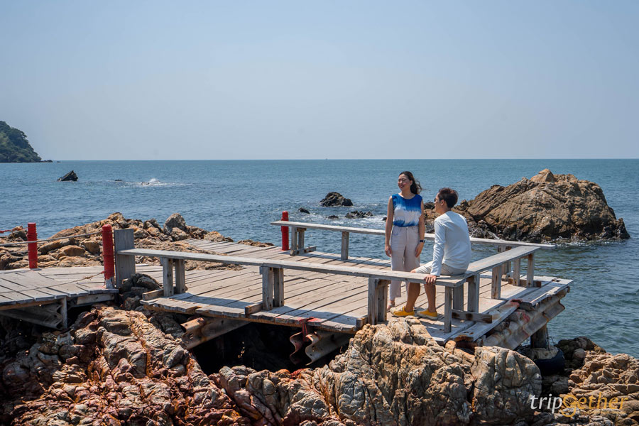 อีกหนึ่งจุดชมวิวสวยๆ ที่อยู่ในเส้นทางเดียวกับจุดชมวิวเนินนางพญานั่นก็คือ จุดชมวิวบ้านหัวแหลม มีสะพานไม้ทอดยาวสู่กลางทะเลให้เดินชิลล์ๆ ระยะทางประมาณ 50 เมตร เป็นสะพานที่สร้างขึ้นจากพลังศรัทธาของชาวบ้าน เป็นทางเดินเพื่อสักการะ เจดีย์สีขาว เก่าแก่ตั้งอยู่บนโขดหินกลางน้ำทะเล (แต่สะพานไม้ยาวไม่ถึงเจดีย์ จะสามารถเดินถึงก็ต่อเมื่อน้ำลดลง) หรือที่ชาวบ้านเรียกกันว่า เจดีย์บ้านหัวแหลม มีอายุกว่า 200 ปี เป็นสิ่งศักดิ์สิทธิ์ที่ยึดเหนี่ยวจิตใจของชาวประมงที่นี่ มีจุดสำหรับการสักการะบูชา ถวายธูปเทียน พวงมาลัย ดอกไม้ ตามศรัทธา ขอบอกว่าช่วงเย็นที่จุดชมวิวบ้านหัวแหลมเป็นอีกหนึ่งจุดชมพระอาทิตย์ตกที่สวยงามไม่แพ้กัน