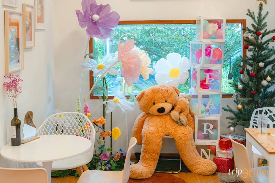 มุมถ่ายรูปในคาเฟ่ก็เยอะมาก ทั้งอินดอร์และเอาท์ดอร์ แถมมีพร็อพเก๋ๆ ให้ด้วยนะและโซนที่นั่งตกแต่งอบอุ่นเหมือนอยู่สวนหลังบ้านเลยล่ะ