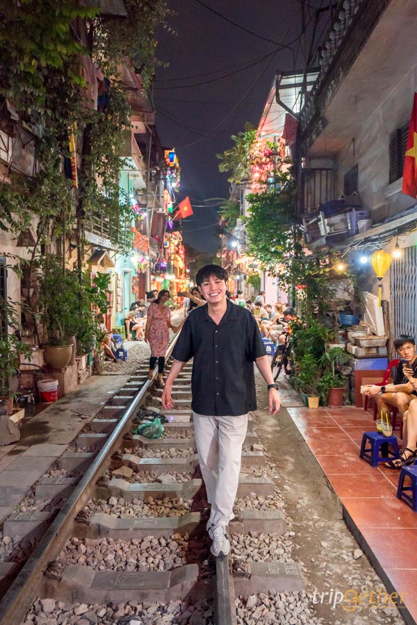 นั่ง Grab Bike จากทะเลสาบฮว่านเกี๋ยมมาเที่ยวกันที่โลเคชั่นสุดอันซีนอีกแห่งในกรุงฮานอย นั่นก็คือ ทางรถไฟฮานอย โดยความเก๋ของที่นี่คือทางรถไฟที่อยู่ติดกับคาเฟ่และร้านอาหารกันแบบเฉียดฉิว เลยทำให้ที่นี่มีนักท่องเที่ยวเข้ามาเยอะมากๆ แต่แอบกระซิบว่าการจะเข้ามายังร้านต่างๆ ริมทางรถไฟ จะต้องมีคนที่เป็นคล้ายๆ กับนายหน้าที่คอยหาลูกค้าให้ร้านด้านใน พาเข้ามาและเลือกร้านให้เราเองเท่านั้น ไม่สามารถเดินเข้ามาเองและเลือกร้านนั่งเองได้ (ตอนเราไป เราเจอเหตุการณ์แบบนี้นะ)