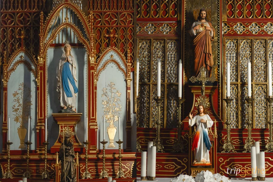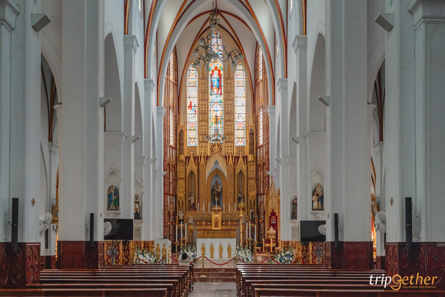 บอกเลยว่าที่นี่แอบถ่ายรูปยากอยู่เหมือนกัน เพราะคนเยอะมากๆ เราเลยหลบเข้ามาดูความสวยงามด้านในโบสถ์กันก่อน ด้านในเป็นโถงกว้าง มีแท่นเคารพที่สวยอลังการ พร้อมกับภาพหน้าต่างที่มีกระจกโมเสกประดับไว้อย่างสวยงาม แถมบรรยากาศด้านในเงียบสงบมากๆ และยังมีชาวคริสต์แวะเวียนเข้ามาอธิษฐานและสวดภาวนากันเยอะมาก