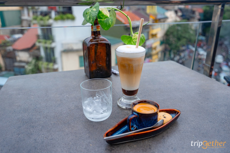 เมนูที่เราสั่งมาเป็นเมนู Iced Mocha กาแฟเข้มๆ ตัดด้วยความกลมกล่อมของช็อคโกแลต ลงตัวมากๆ แถมด้านบนยังท็อปด้วยฟองนมนุ่มๆ ราคาอยู่ที่ 79,000 VND และเซ็ต Espresso ที่เสิร์ฟมาแบบร้อน พร้อมแก้วน้ำแข็งและคุกกี้ ราคา 49,000 VND