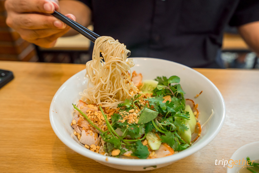 เมนูอาหารของทางร้านเน้นเป็นเมนูเส้นแบบสไตล์เวียดนาม ซึ่งเราสั่งเป็น บะหมี่แห้ง (Dry Egg Noodle) บะหมี่หอมๆ หมูแดง ผัก (ที่นี่ใส่แตงกวาและใบสะระแหน่ด้วย) และโรยถั่วด้านบน ราคาชามละ 40,000 VND