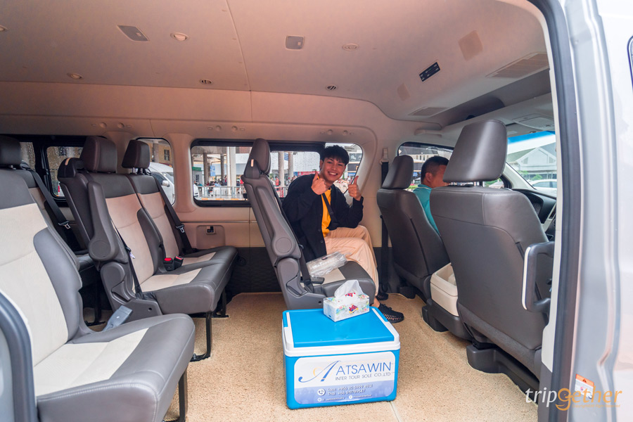 เพื่อไม่เป็นการเสียเวลา เราเลยขึ้นรถตู้เพื่อออกเดินทางไปเที่ยวกันพร้อมกับซาลาเปาร้อนๆ ต้องบอกเลยว่าจริงๆ แล้วรถนำเที่ยวของอัศวิน อินเตอร์ ทัวร์ มีให้เลือกหลายแบบมากเลยนะ แต่รอบนี้ขอนั่งแบบสบายๆ เราเลยเลือกเป็นรถตู้คันใหญ่ ที่มีที่นั่งมากถึง 13 ที่ ภายในรถเหมือนกับนั่งอยู่บนเครื่องบินมากๆ มีทั้งส่วนของไฟอ่านหนังสือ ที่เสียบชาร์จแบต แถมยังมีบริการน้ำดื่มให้ด้วย สะดวกมากๆ เอาเป็นว่าถ้าใครสนใจเที่ยวสบายๆ แบบเราติดต่อได้เลยที่ Atsawin Inter Tour เบอร์ 061 978 9547 และ Line ID: lord519 (คุณหลอดแก้ว) หรือทางเพจ Atsawin inter tour ບໍລິສັດອັດສະວິນອິນເຕີທົວ