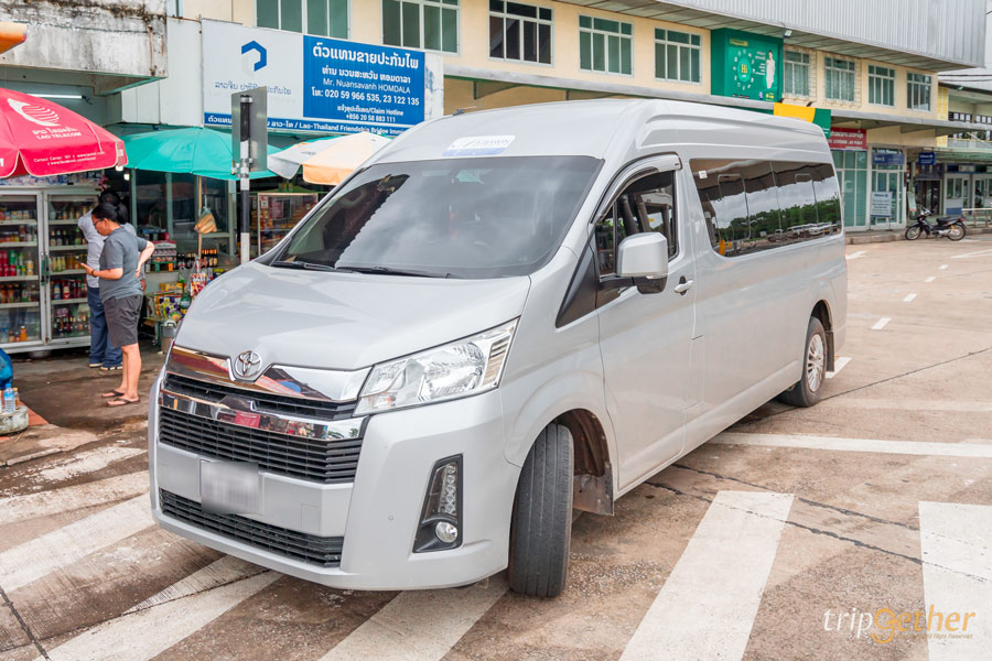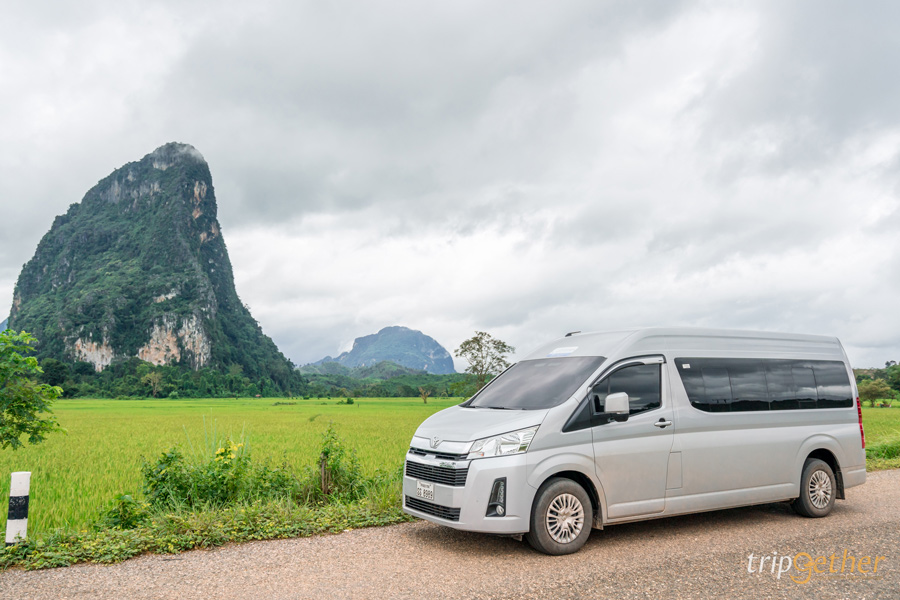 ผ่าน ตม.ของ สปป.ลาว มาแล้ว ทริปนี้เราจะแวะไปเที่ยวที่เมืองเฟืองกันก่อน เลยได้จองเหมารถตู้ไว้ ทริปนี้เราใช้บริการ อัศวิน อินเตอร์ ทัวร์ ซึ่งเป็นบริษัทของทางฝั่ง สปป.ลาว ที่มีบริการการท่องเที่ยวครบวงจร เราเลือกเหมารถตู้ VIP 3 วัน ราคา 9,000 บาท ซึ่งราคานี้รองรับได้ 13 คน รวมค่าน้ำมันรถ ค่าทางด่วน และค่าใช้จ่ายอื่นๆ ที่เกี่ยวกับการเดินทางทั้งหมด ถ้าใครไปกันเป็นกลุ่มใหญ่และต้องการความสบายเลือกการเดินทางแบบเหมารถตู้จะสะดวกมาก แต่นอกจากรถตู้ก็ยังมีการเดินทางแบบอื่น อย่างเรียก Grab ก็ได้เหมือนกัน
