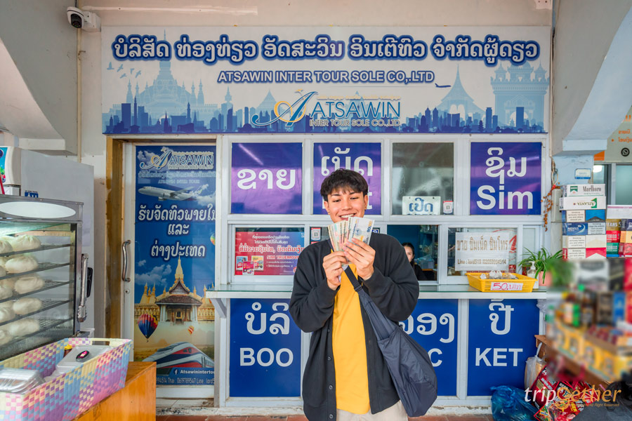 มาถึงลาวแล้ว สิ่งแรกที่ต้องทำเลยก็คือแลกเงินและซื้อซิมโทรศัพท์ โดยบริเวณด่านจะมีธนาคารไว้ให้แลกเงินด้วย ซึ่งช่วงที่เราไป (แลกเงินวันที่ 27 กันยายน 2566) อัตราแลกเปลี่ยนจะอยู่ที่ 1 บาท: 610 กีบ แลกไป 3 – 4 พันบาทก็ได้จับเงินเป็นล้านกีบเลย อีกสิ่งที่ต้องมีไว้สำหรับเดินทางคือซิมโทรศัพท์ ก็ซื้อได้ที่เคาน์เตอร์ของอัศวิน อินเตอร์ ทัวร์ มีแพ็คเกจหลายแบบให้เลือกทั้ง 3 วัน 7 วัน หรือเป็นเดือนก็มีเด้อ สำหรับทริปนี้เราใช้แบบ 7 วัน ราคา 25,000 กีบ