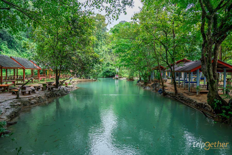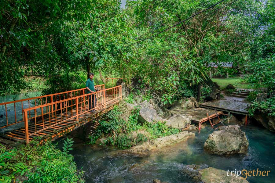 เดินไม่ไกลมากเราก็มาถึงทางขึ้นถ้ำ แต่สิ่งที่ทำให้สะดุดตามากๆ เลยก็คือลำธารที่ไหลออกมาจากถ้ำตามรูปเลยทุกคน น้ำมันทั้งใส ทั้งสีฟ้า มองเห็นถึงพื้นน้ำเลย แถมตอนที่เราไปนี่คึกคักเป็นพิเศษเพราะมีเด็กๆ มากระโดดน้ำเล่นกันแบบสนุกสนานมาก ใจจริงก็อยากลงไปเล่นด้วยนะ แต่ไม่ได้เอาชุดมาเปลี่ยนนี่สิ