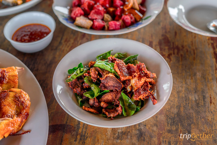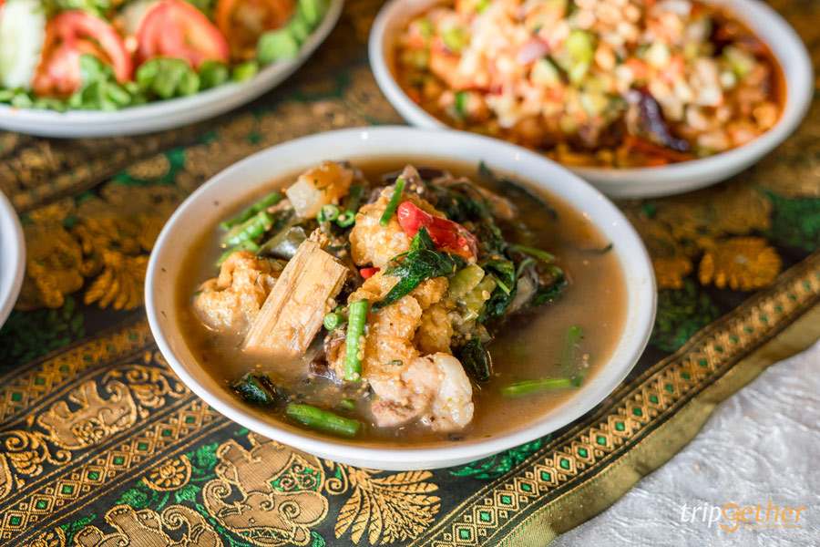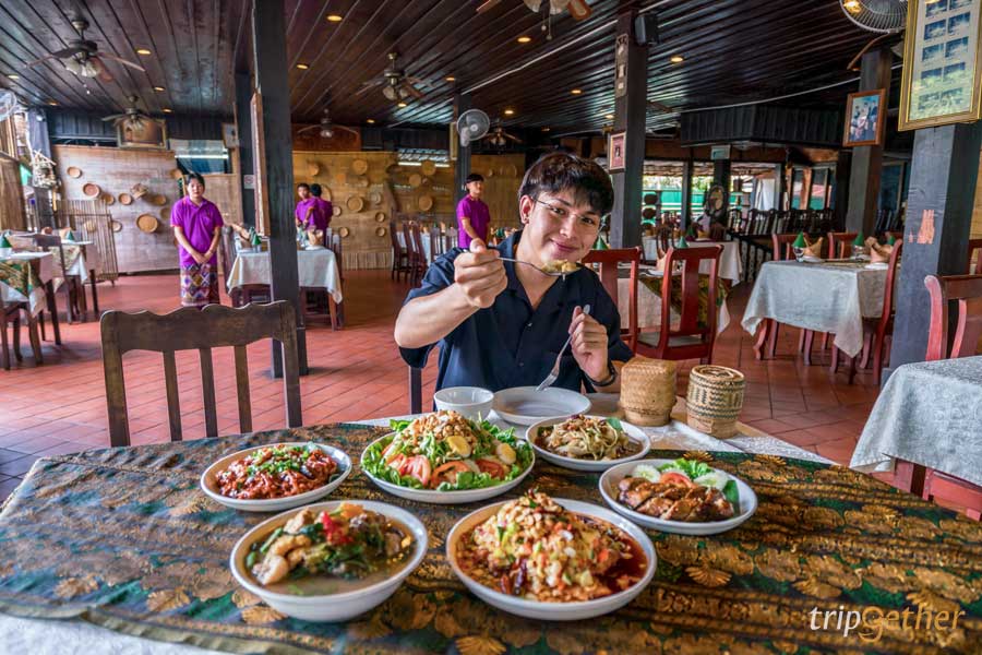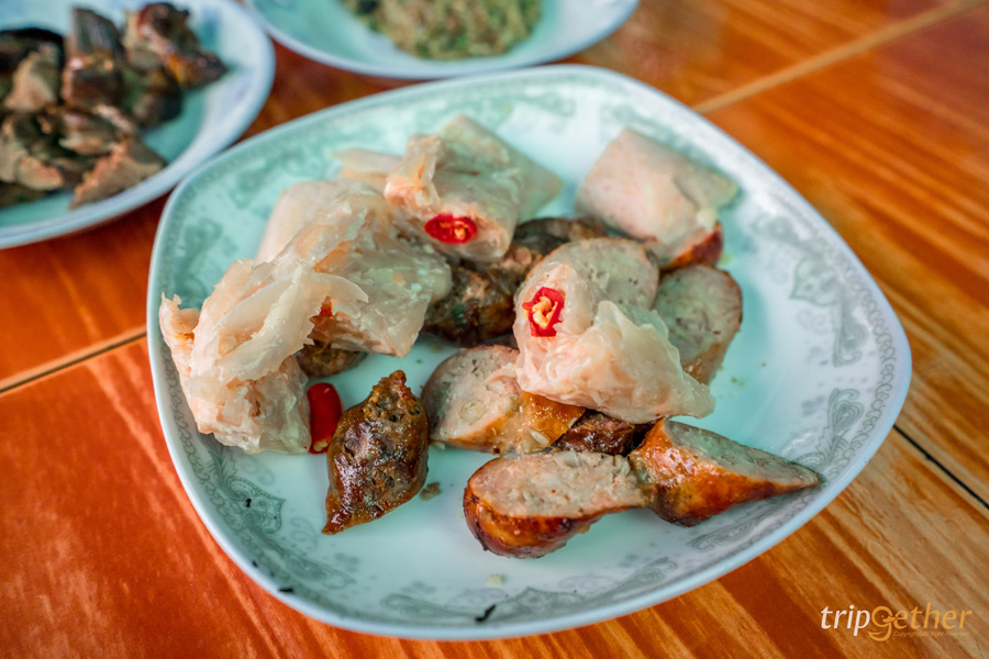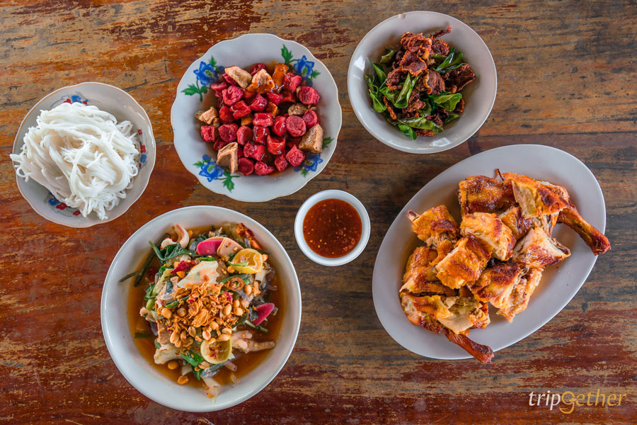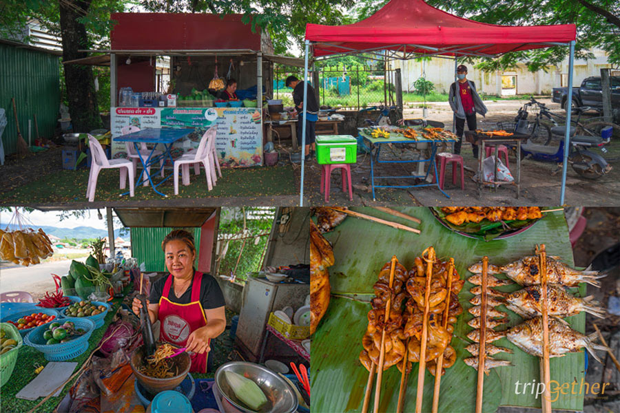อาหารของที่นี่ส่วนใหญ่ก็จะเป็นเมนูที่เราคุ้นชินกัน อย่างไส้กรอกลูกชิ้นทอด ไก่อบโอ่ง ส้มตำ ขนมจีน แต่ที่พี่คนขับรถแนะนำให้สั่งมาลองเลยก็คือ เหงือกวัวทอด (คนที่นี่เรียกทอดเหือก) แรกๆ ก็งงๆ อยู่เหมือนกันว่ามันคือเมนูอะไร แต่พอเอาเมาเสิร์ฟเท่านั้นแหละ ไม่ได้ถึงบางอ้อนะ แต่ประหลาดใจมากๆ เพราะไม่เคยเห็นเมนูนี้มาก่อน แถมไม่เคยรู้ด้วยว่าเหงือกวัวมันกินได้