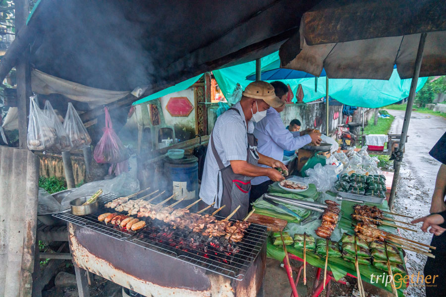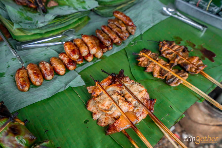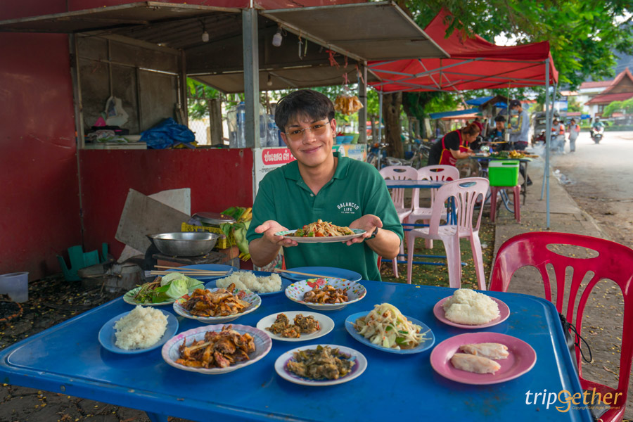 นาฬิกาปลุกตั้งแต่ตี 5 กว่าๆ ลุกมาอาบน้ำ แต่งตัวพร้อมลุย เพราะเช้านี้จุดหมายของเราคือผาหนามไซ จุดเช็คอินยอดฮิตอีกแห่งหนึ่งของวังเวียง ที่เราเลือกจะเดินขึ้นกันตั้งแต่เช้าก็เพราะว่าเราอยากขึ้นไปดูหมอกสวยๆ กับอากาศที่เย็นสบาย แต่ก่อนที่จะขึ้นเขา เราก็ต้องชาร์จพลังงานกันด้วยมื้อเช้า มื้อนี้พี่คนขับรถพาแวะร้าน Local ที่เป็นฟีลแบบร้านขายหมูปิ้งที่เราคุ้นชินกัน แต่ร้านนี้ขายของปิ้ง ของย่างเยอะมาก ทั้งไส้อั่ว ตับปิ้ง ก้อยมะเขือ และอีกเยอะมาก