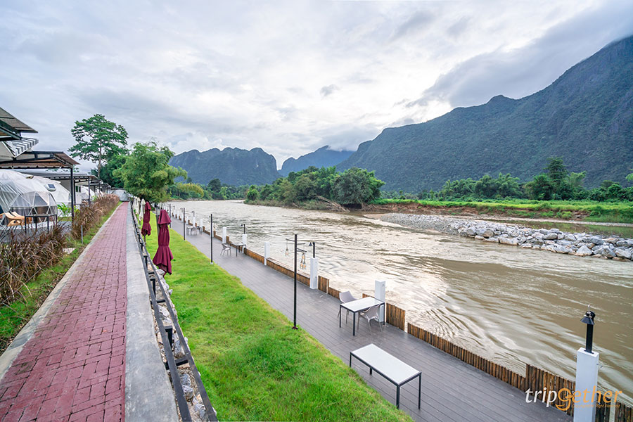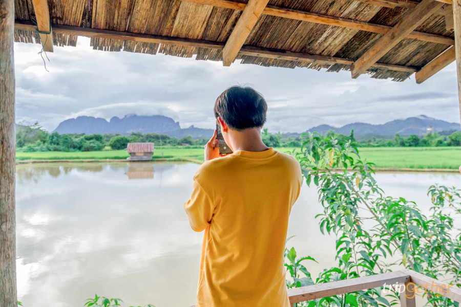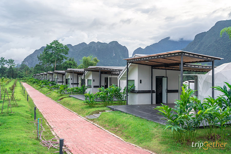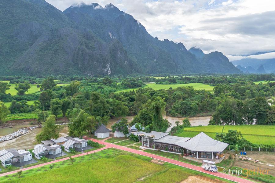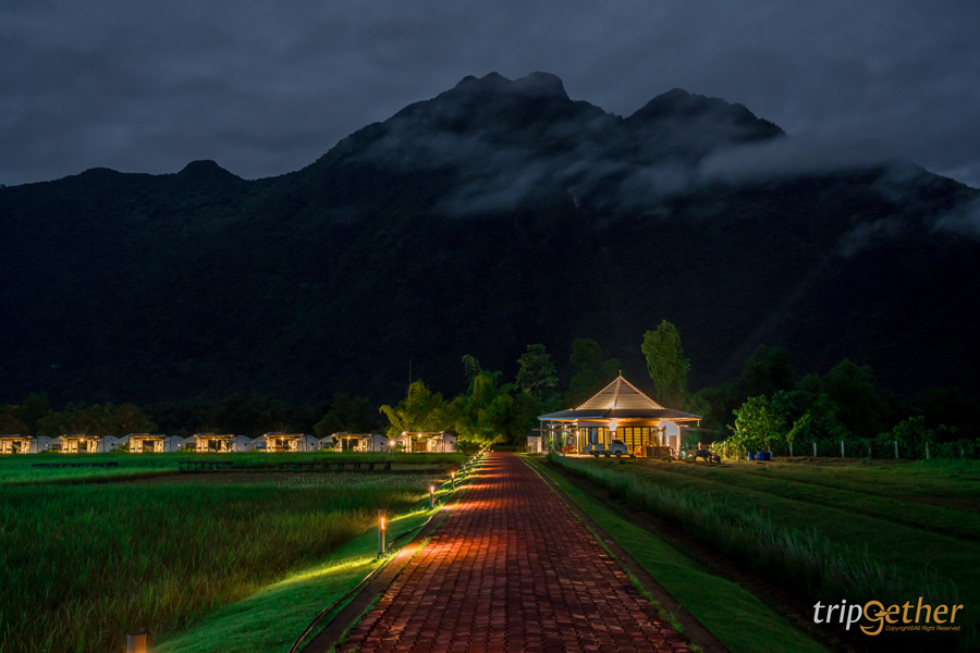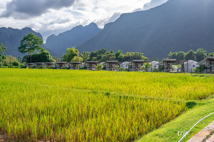 นั่งรถมาประมาณ 30 นาที ก็มาถึงโลเคชั่นที่ทำให้เราลืมความเหนื่อยไปอีกครั้ง เพราะที่พักของเราในคืนนี้มันช่างสวยงามอลังการแบบสุดๆ ไปเลย ซึ่งเราเข้าพักที่ Family Land Camping Resort ที่พักวังเวียงติดริมแม่น้ำซองที่เพิ่งเปิดใหม่ มาพร้อมกับวิวภูเขาขนาดใหญ่แบบพาโนราม่าเลยทุกคน แถมยังอยู่ติดกับริมท้องทุ่งนาสีเขียวด้วยนะ บรรยากาศให้เต็มร้อยแบบไม่หักเลย