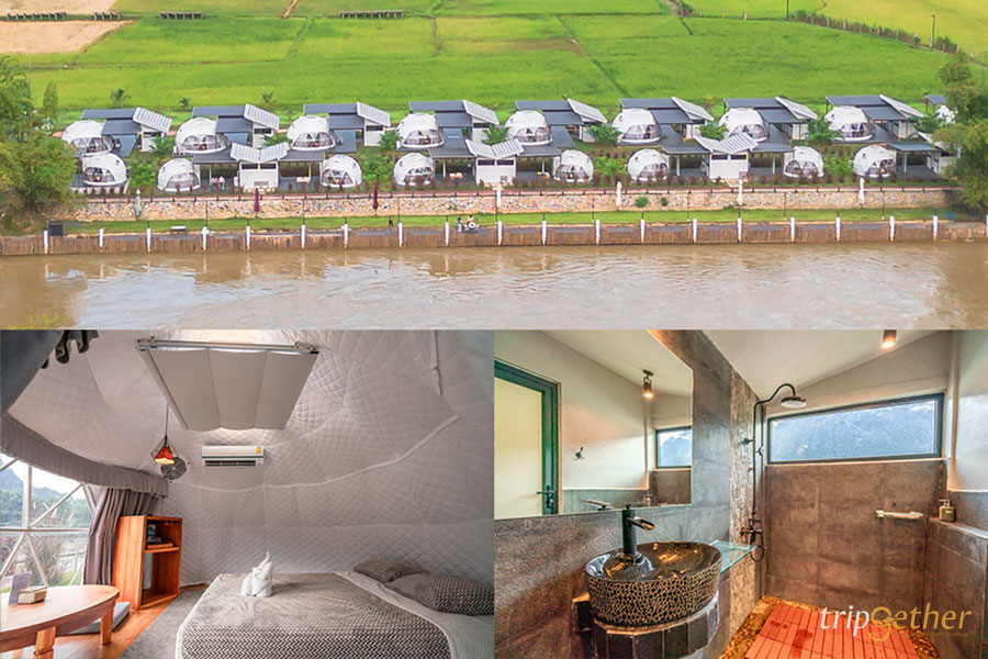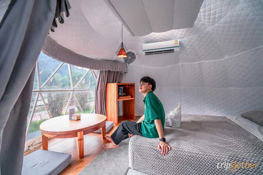 ห้องพักของ Family Land Camping Resort จะแบ่งออกเป็น 2 แบบ (ช่วงที่เราไปนะ เพราะตอนนี้กำลังสร้างโซนวิลล่าเพิ่ม) คือโดมติดทุ่งนา ที่มีขนาดห้อง 5×5 ตารางเมตร และโดมติดริมน้ำ ที่ห้องจะอยู่ที่ 4×4 ตารางเมตร ซึ่งในคืนนี้เราเลือกนอนโดมริมน้ำ เพราะความพิเศษของโดมริมน้ำก็คือนอกจากจะอยู่ติดกับริมแม่น้ำและเห็นวิวภูเขาได้แบบเต็มๆ แล้ว ส่วนของโดมยังเป็นโดมใสที่สามารถนอนดูวิวได้จากบนเตียงเลยด้วย ในส่วนของห้องน้ำจะแยกออกมาอยู่ด้านนอก ภายในมีสิ่งอำนวยความสะดวกครบเลย ทั้งเครื่องทำน้ำอุ่น ผ้าขนหนู กระจกบานใหญ่