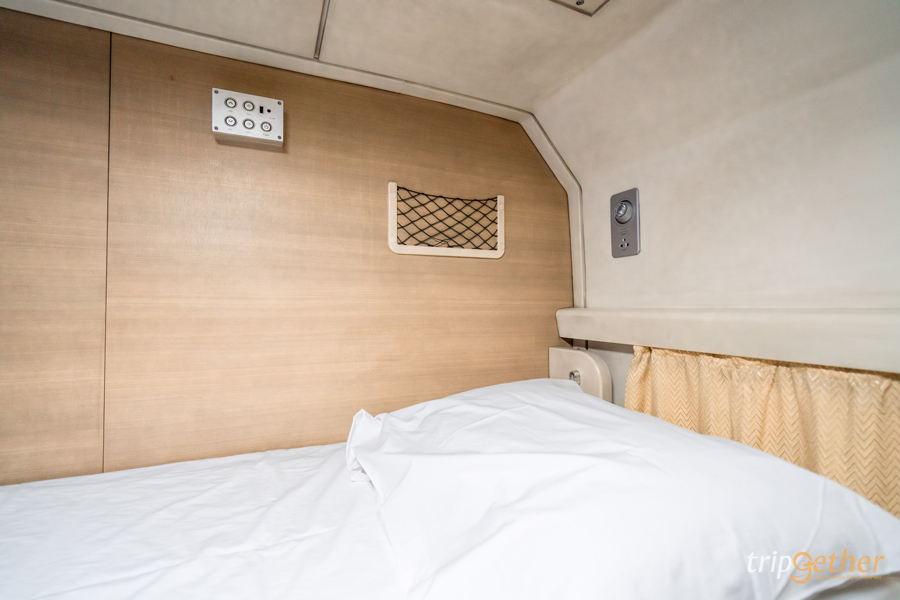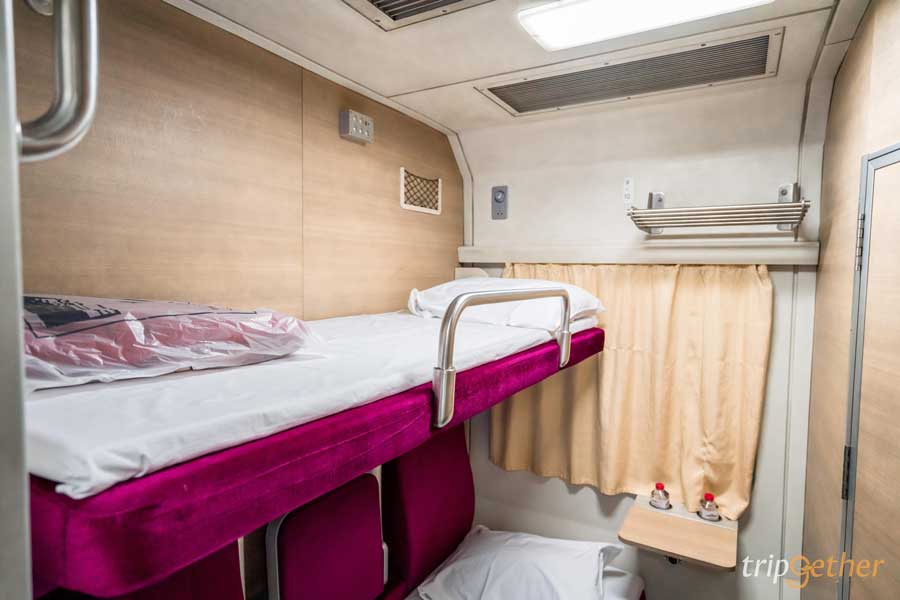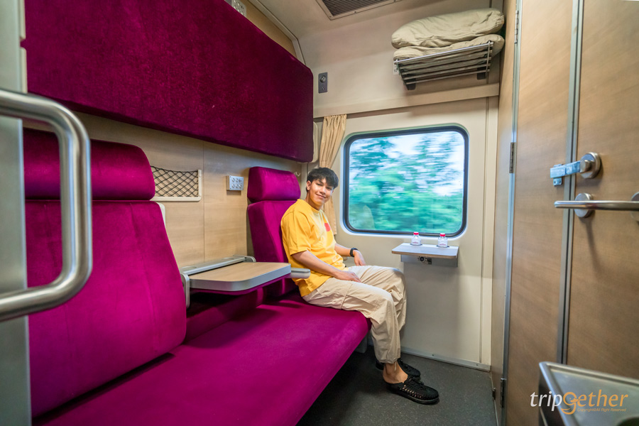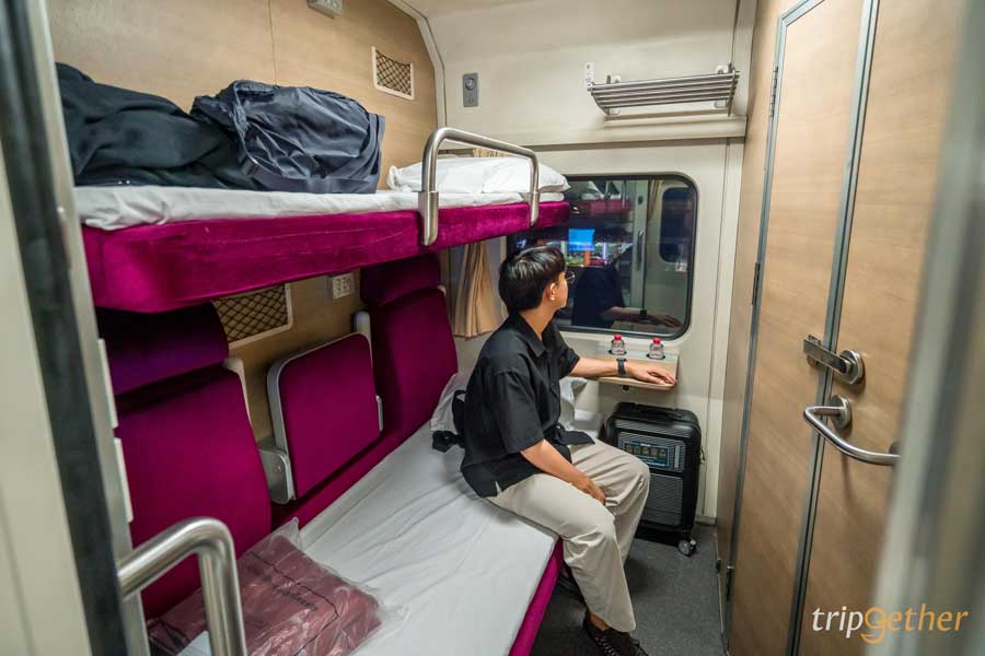 รอไม่นานรถไฟก็มาเทียบที่ชานชาลา แต่เราอาจจะต้องเดินไกลหน่อย เพราะตู้รถไฟที่เป็นตู้นอนจะอยู่ที่ตู้หมายเลข 13 (ตู้สุดท้ายกันเลย) เดินแบบยาวๆ เข้ามาในตู้รถไฟแล้ว ก็ขอบอกรายละเอียดกันสักหน่อย รถไฟขบวนด่วนพิเศษ CNR กรุงเทพฯ – หนองคายนี้ เป็นรถโบกี้นั่งและนอน ชั้น 1 ปรับอากาศ ที่จะแบ่งเป็นห้องๆ แต่ละห้องสามารถนอนได้ 2 คน ซึ่งจะแบ่งเป็นเตียงบนและเตียงล่าง (ด้วยความที่เป็นรถไฟรอบกลางคืน เจ้าหน้าที่เลยปูที่นอนไว้ให้เรียบร้อยแล้ว) ด้านข้างติดกับประตูมีกระจกและอ่างล้างหน้าไว้ให้พร้อม แถมส่วนที่เป็นกระจกยังมีโต๊ะเล็กๆ ไว้ให้วางของด้วยนะ