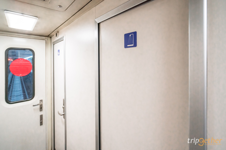 ความพิเศษที่ชอบมากของรถไฟชั้น 1 นี้ก็คือ มีส่วนของห้องอาบน้ำให้ด้วย ลักษณะเป็นห้องน้ำที่ไม่ใหญ่มาก มีฝักบัวที่น้ำแรงใช้ได้เลย พื้นห้องน้ำยังเป็นผ้ายางกันลื่นให้ด้วย สายชอบอาบน้ำย่างเราก็สบายเลยคราวนี้~