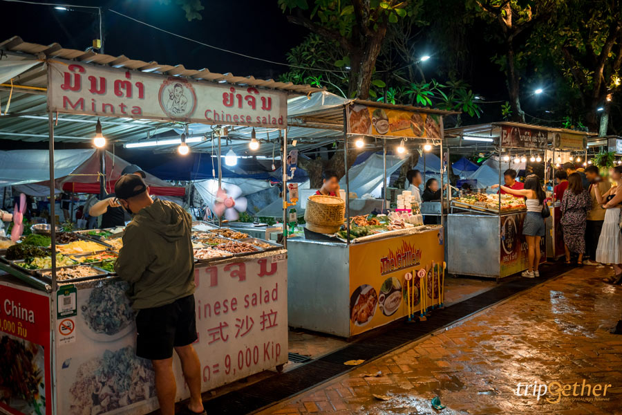 เดินเที่ยวในวัดเชียงทองจนฟ้าเริ่มมืด เราก็มาต่อกันที่ ตลาดมืดหลวงพระบาง หรือถนนคนเดินของหลวงพระบาง ซึ่งจะตั้งอยู่ที่ถนนข้างพระราชวังหลวงพระบาง บรรยากาศคักคักมากๆ มีร้านค้า ร้านอาหารมาวางขายกันเพียบ