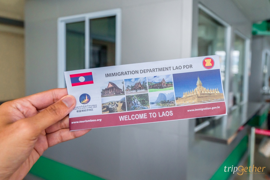 ขั้นตอนการเข้าประเทศลาวไม่มีอะไรยุ่งยากเลย เพราะคนไทยไม่ต้องใช้ visa เราเลยสามารถเข้าแถวไปรับใบกรอกข้อมูลของ ตม.ลาวได้เลย โดยเราจะต้องกรอกข้อมูลทั่วไป อย่างชื่อ – สกุล ข้อมูลของหนังสือเดินทาง ข้อมูลส่วนตัว วิธีการเดินทางมายังลาว และที่พักในลาว ที่เราจะเข้าพัก และสำคัญมากๆ เลยตรงที่ใบเอกสารนี้จะมี 2 ส่วน คือส่วนเข้าประเทศ และส่วนออกประเทศ ซึ่งเราจะต้องเก็บส่วนออกประเทศไว้ให้ดี ห้ามหายเด็ดขาดเลยนะ เมื่อกรอกเสร็จแล้ว ก็ไปยื่นให้เจ้าหน้าที่พร้อมกับหนังสือเดินทางได้เลย เตรียมเงินสำหรับค่าธรรมเนียมไว้ด้วยนะ คนละ 20 บาท (จ่ายเป็นเงินไทยได้)