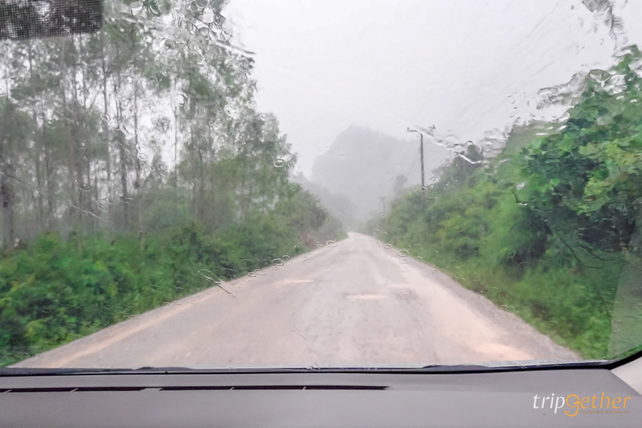 นั่งกินข้าวกันจนอิ่มแล้ว พอจ่ายเงินขึ้นรถตู้เท่านั้นแหละ ฝนห่าใหญ่ก็ถล่มลงมาจนขาวโพลน ทันใดนั้นก็เหมือนฟ้าฝ่าลงกลางใจ เพราะพี่คนขับรถหันมาบอกว่าฝนตกขนาดนี้ ผาหนามไซอันตรายเกินไป ขึ้นไม่ได้ เราก็เลยต้องเปลี่ยนแพลนกะทันหัน สิ่งที่ยากกว่าการทำใจก็คือจะไปอยู่ที่ไหนกันดีระหว่างรอฝน เพราะมันยังเช้าอยู่เลย ที่เที่ยวอื่นๆ ก็ยังไม่เปิดกัน