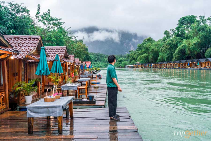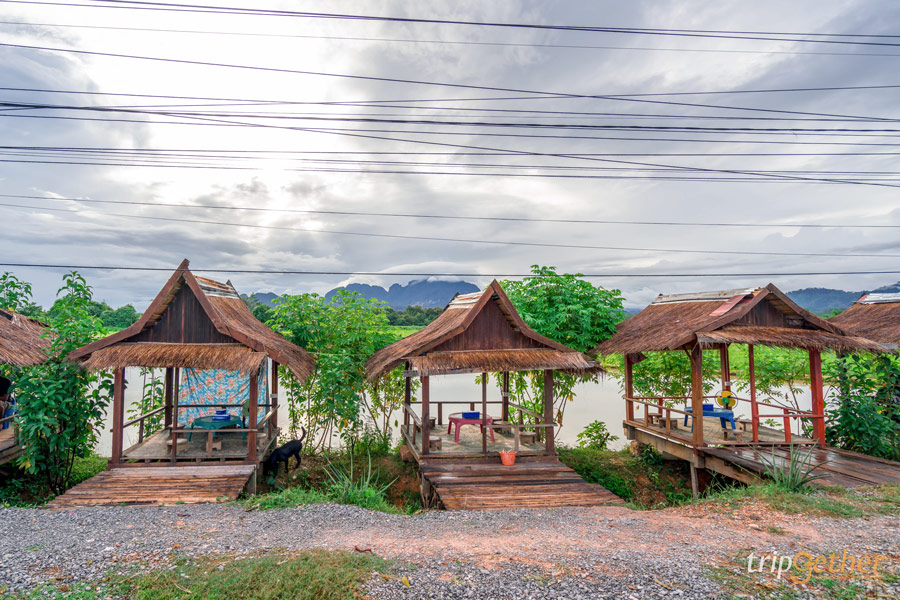 อิ่มอร่อยกับอาหารมื้อแรกที่ลาวกันไปแล้ว เราก็เดินทางมาเช็คอินที่พักในคืนแรกของทริปนี้ที่ เรือนแพวังน้ำทิพย์ เมืองเฟือง ลักษณะที่พักก็ตามชื่อเลยทุกคน เป็นเรือนแพหลังเล็กๆ น่ารัก เรียงกันอยู่ริมแม่น้ำเลย แถมยังมีวิวภูเขาลูกใหญ่ และที่สวยกว่านั้นก็คือสีของน้ำในแม่น้ำ นี่ขนาดฝนตกแทบจะทั้งวันนะ แต่สีของน้ำก็คือเป็นสีฟ้าสวยมาก ไม่แดง ไม่มีสีของโคลนติดมากับน้ำเลยด้วย
