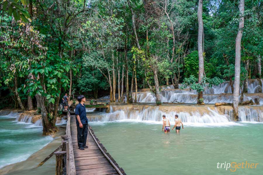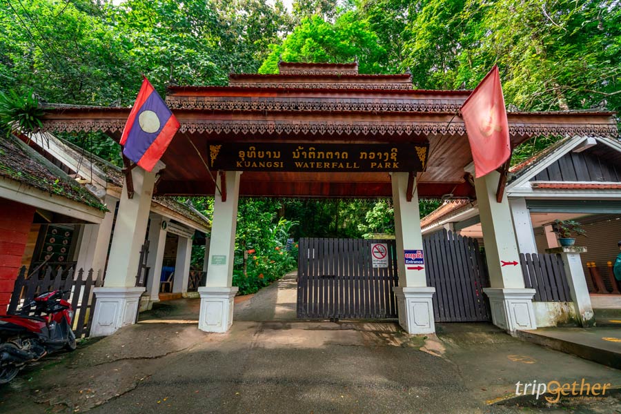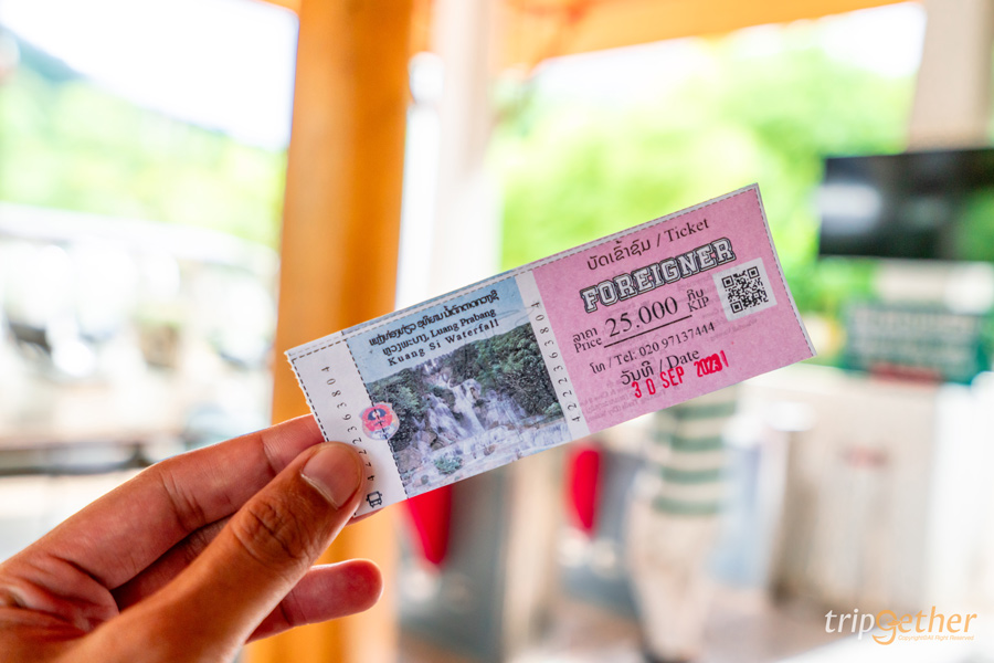 เก็บกระเป๋า เช็คเอาท์แล้ว ออกไปเที่ยวกันต่อยาวๆ โดยมุ่งตรงไปที่น้ำตกตาดกวางสี น้ำตกที่ขึ้นชื่อว่าสวยที่สุดในหลวงพระบาง ซึ่งจะใช้ระยะเวลาในการเดินทางเกือบๆ ชั่วโมงเลย (จริงๆ แล้วระยะทางไม่ได้ไกล แต่เส้นทางต้องลัดเลาะตามแนวเขา) พอถึงทางเข้าน้ำตกแล้ว เราจะต้องซื้อตั๋วเข้าชมก่อน คนละ 25,000 กีบ แล้วทุกคนลองสังเกตที่ตั๋วดีๆ นะ เพราะจะมีคิวอาร์โค้ดสำหรับสแกนด้วย