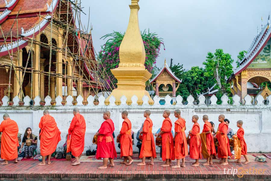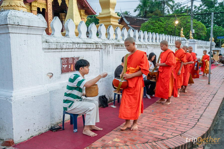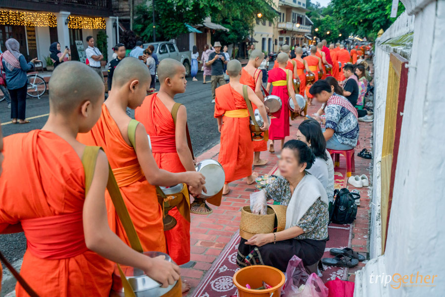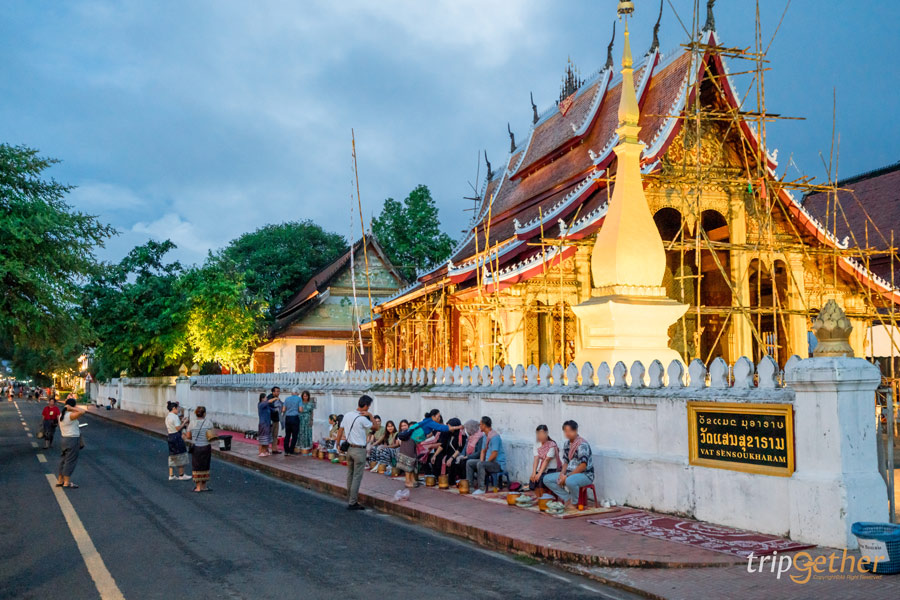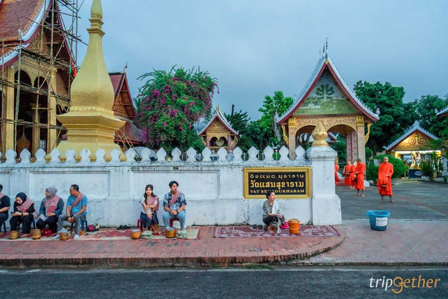 เช้านี้เราออกมาทำกิจกรรมที่เป็นไฮไลท์ความงามทางวัฒนธรรมของหลวงพระบาง อย่างการตักบาตรข้าวเหนียว โดยจุดที่เราเลือกคือบริเวณหน้าวัดแสน (วัดแสนสุขาราม) ซึ่งมีค่าบริการอยู่ที่ชุดละ 50,000 กีบ ซึ่งต้องจ่ายให้กับแม่ค้าตอนไปถึงหน้าวัด ราคานี้รวมข้าวเหนียว 1 กระติ๊บใหญ่ ถุงมือพลาสติกสำหรับหยิบข้าวเหนียว และผ้าคาด (เป็นผ้าที่เอาไว้พาดบ่า เวลาที่ชาวลาวทำบุญหรือเข้าวัด)